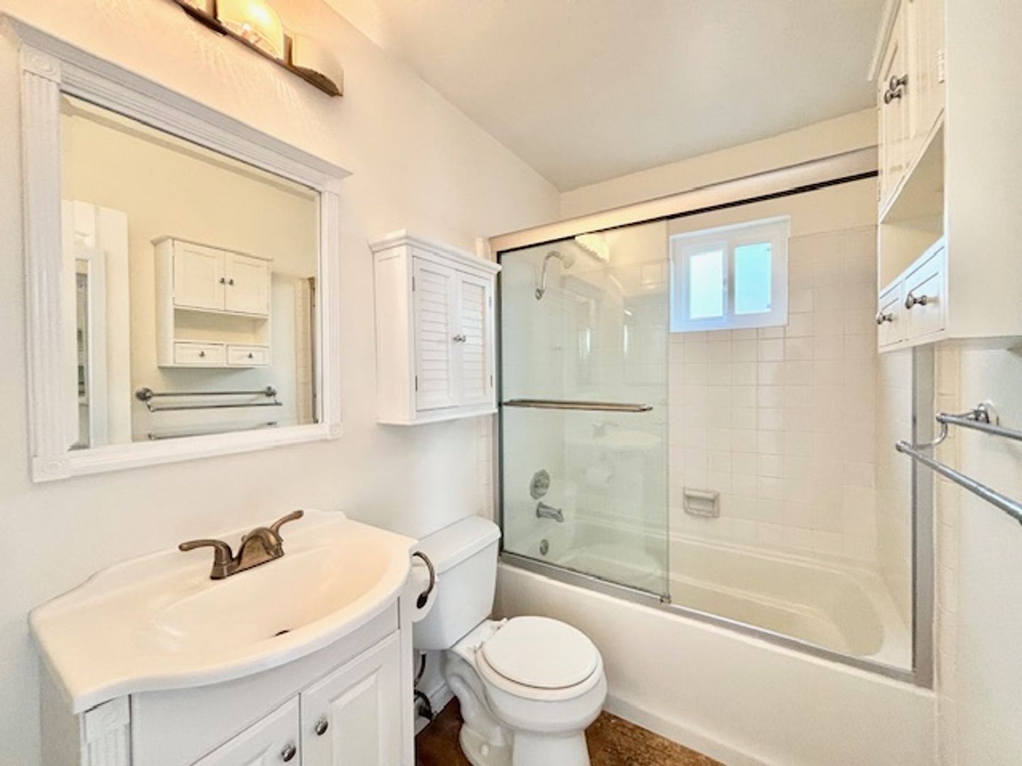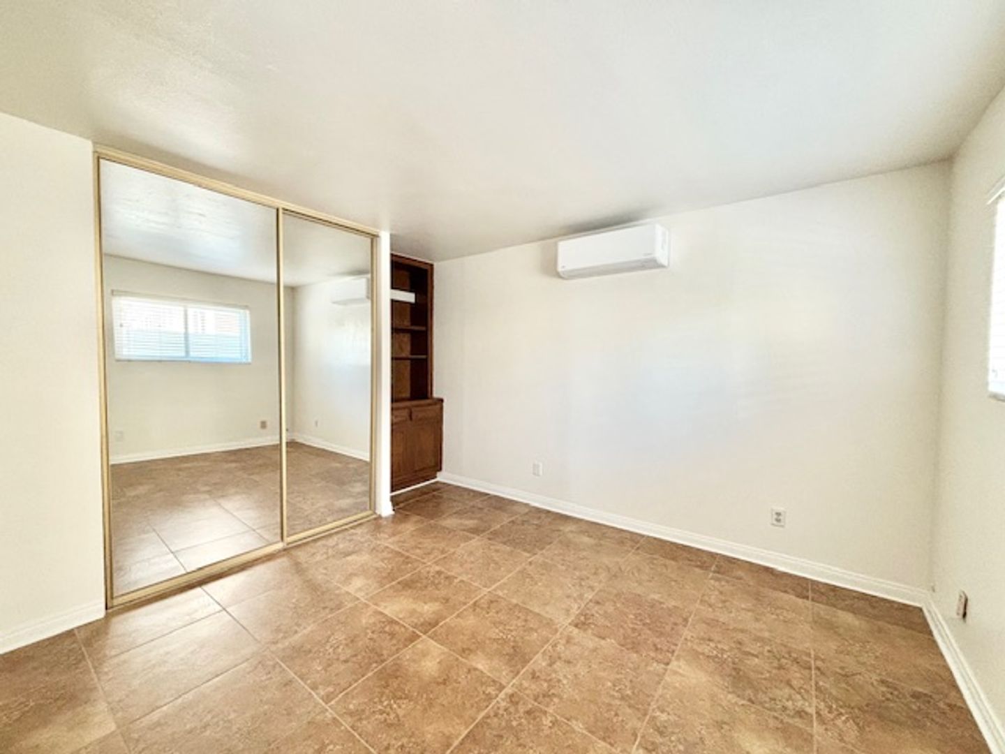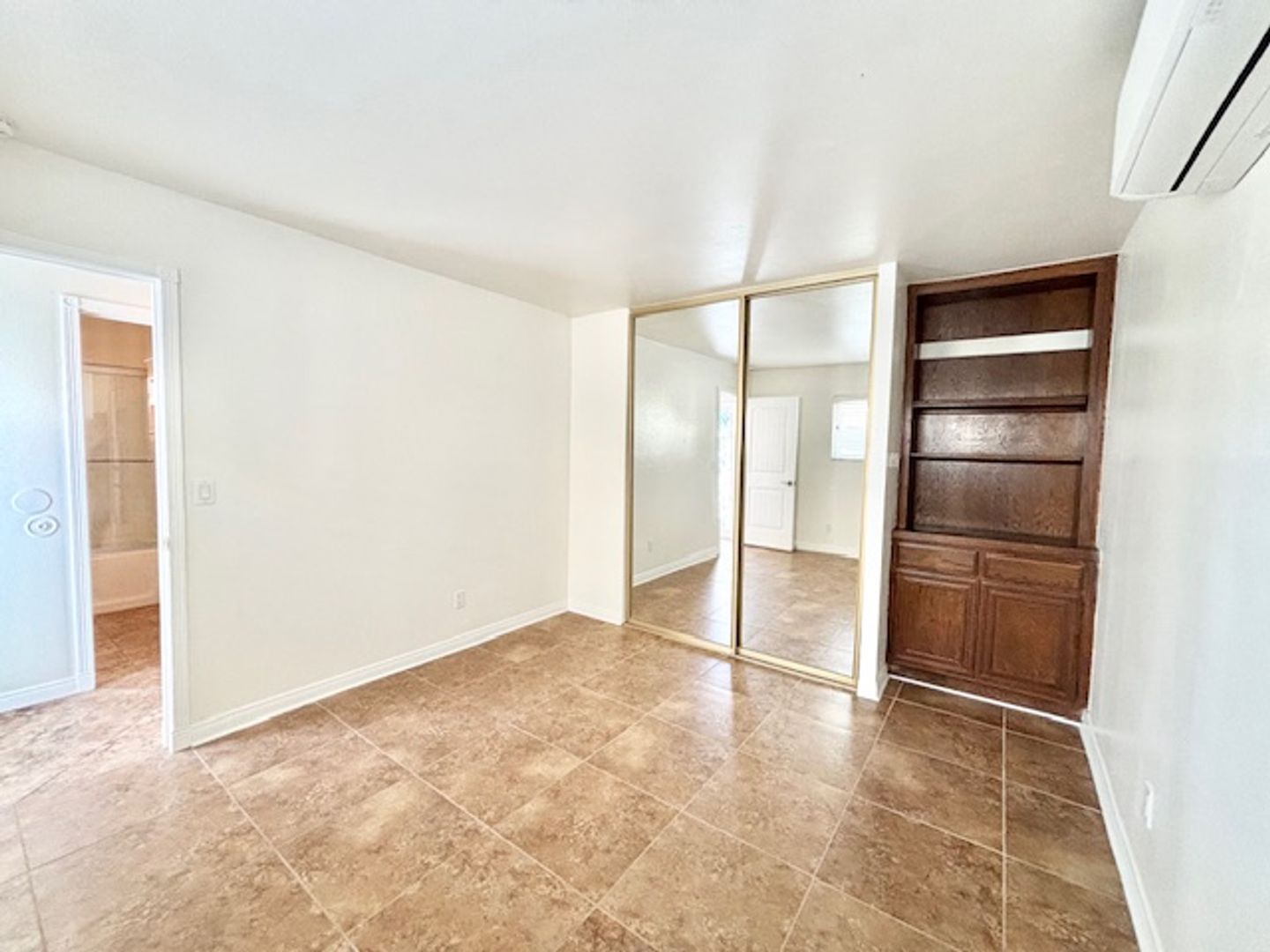 As you enter, you'll find a generous bedroom to your right, complete with built-in shelving and mirrored closet doors that enhance the sense of space. Enjoy comfort year-round with your own mini split AC/Heating unit, and a conveniently located bathroom featuring a shower-tub combo.