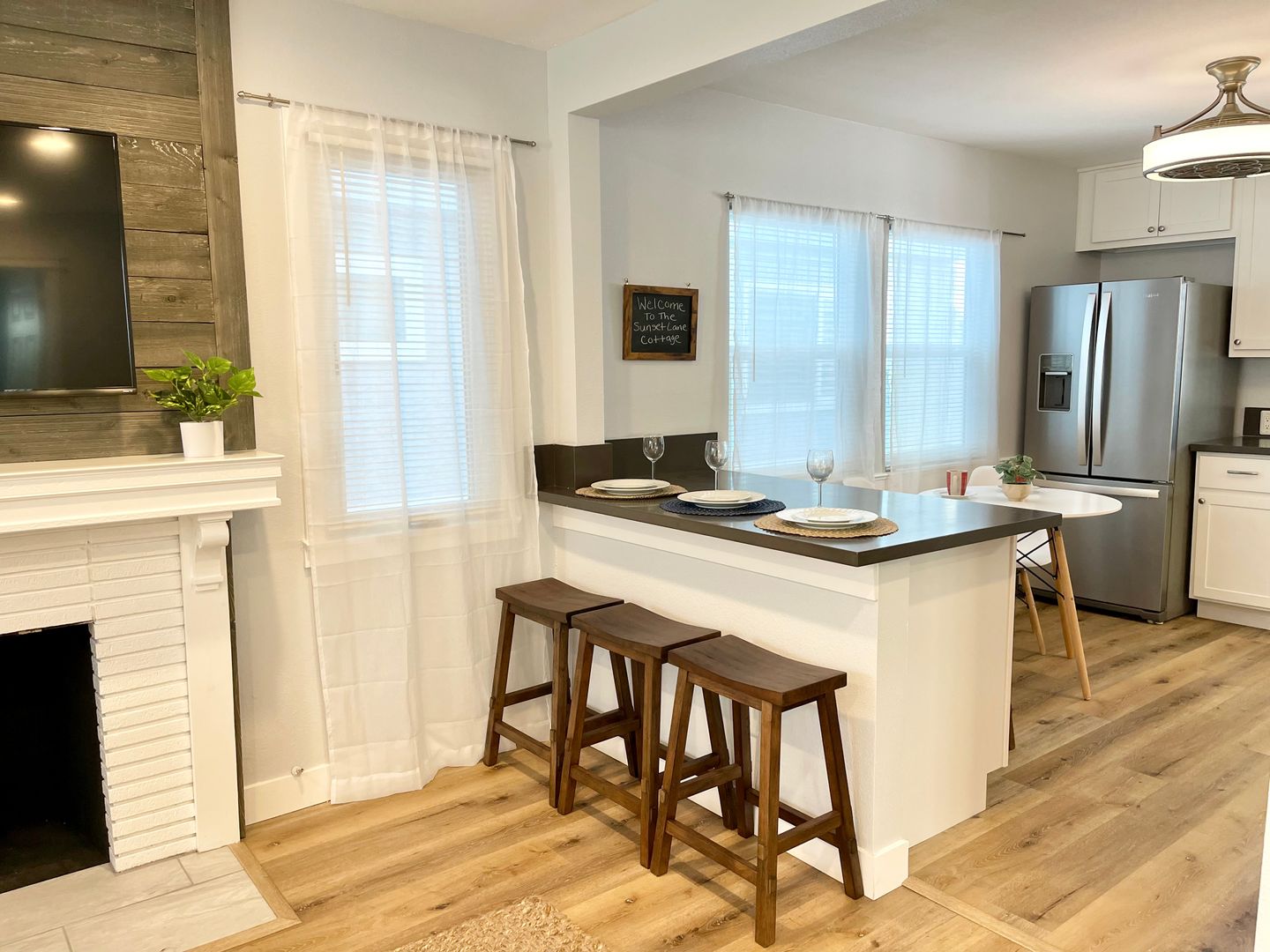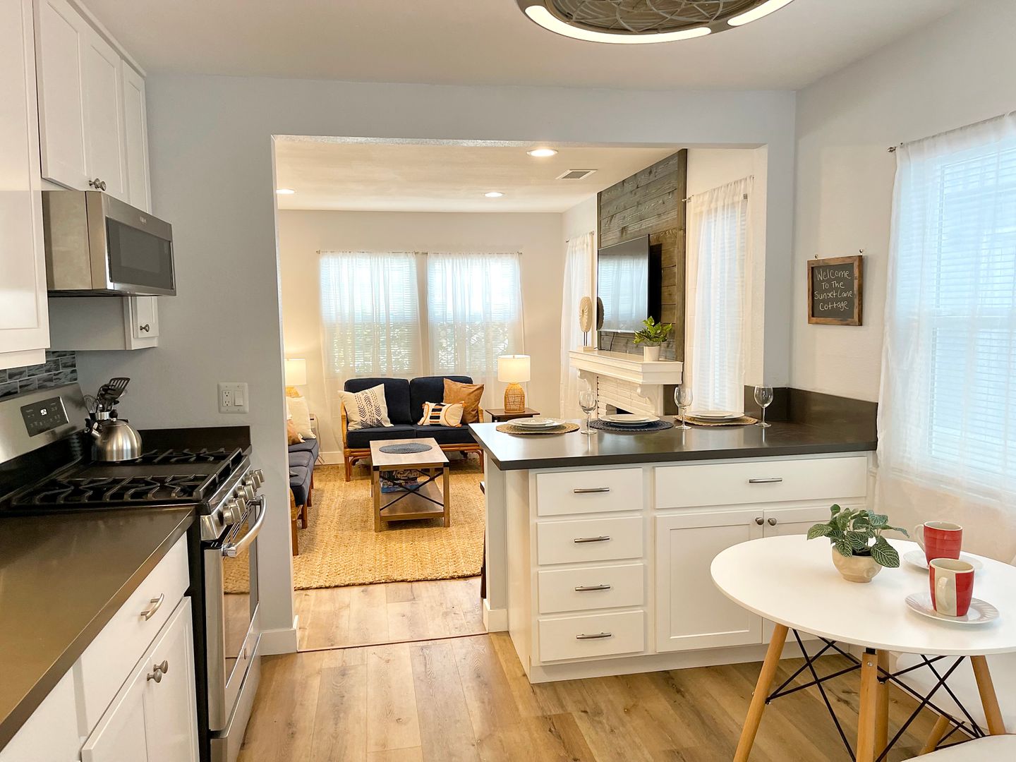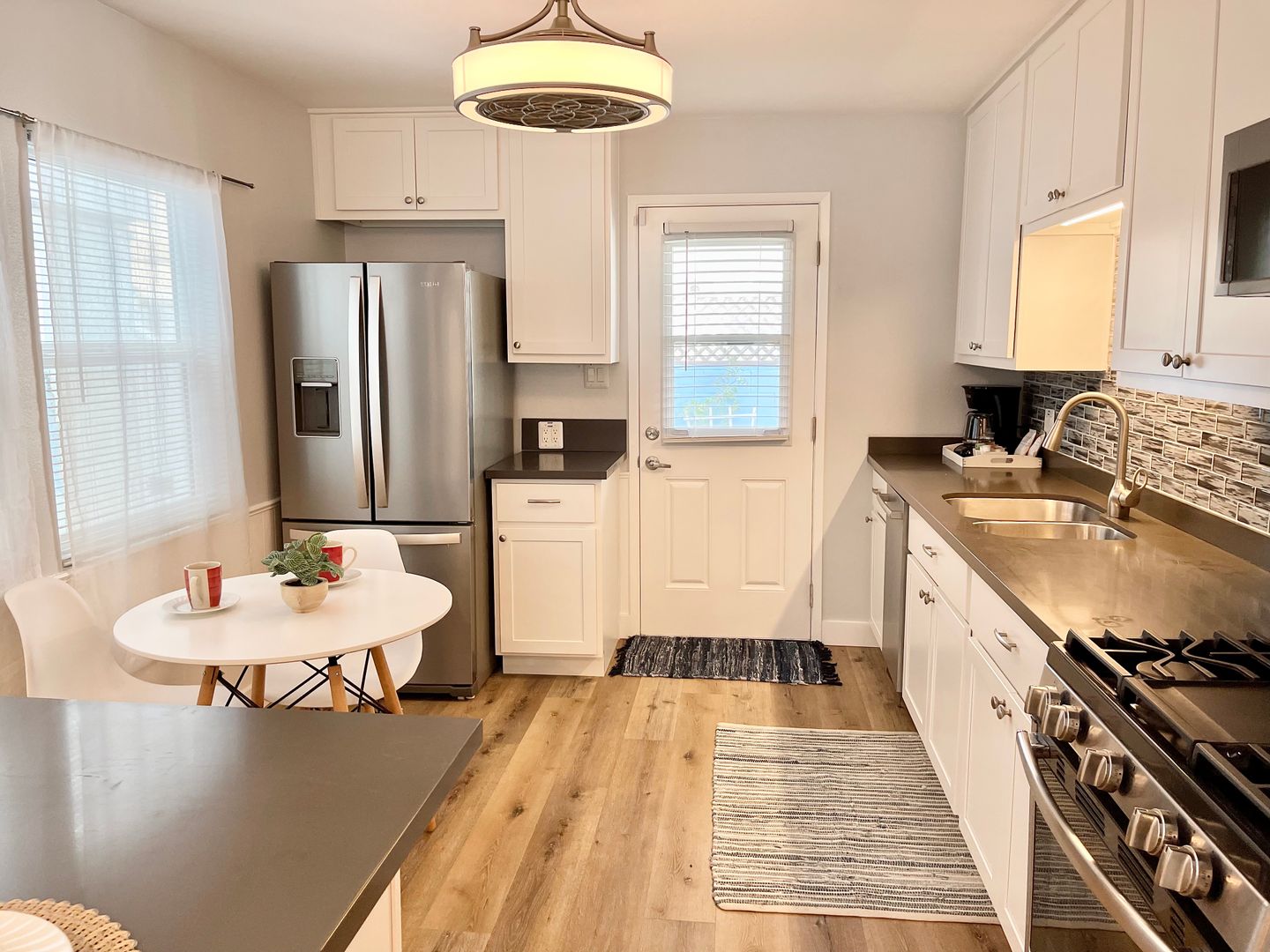 Walk into the home to be greeted by the tastefully decorated living room, equipped with plenty of seating, and a flat screen tv. Find seating for three at the kitchen bar, that leads into the spacious kitchen. The kitchen is newly updated with a brand new backsplash, and beautiful cabinets that are filled with all sorts of cookware. The kitchen provides plenty of room for cooking, and is home to the cutest dining table for two. This table will offer the perfect spot to enjoy your coffee everyday in the morning sunlight!