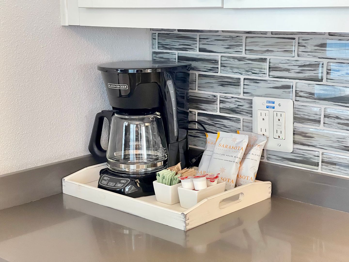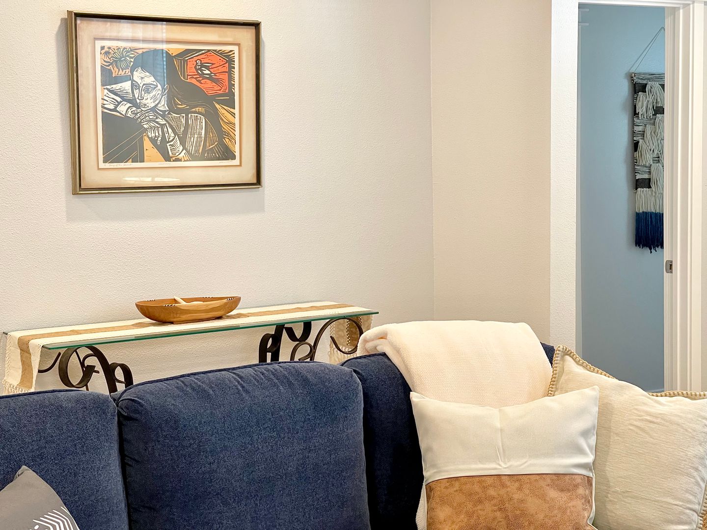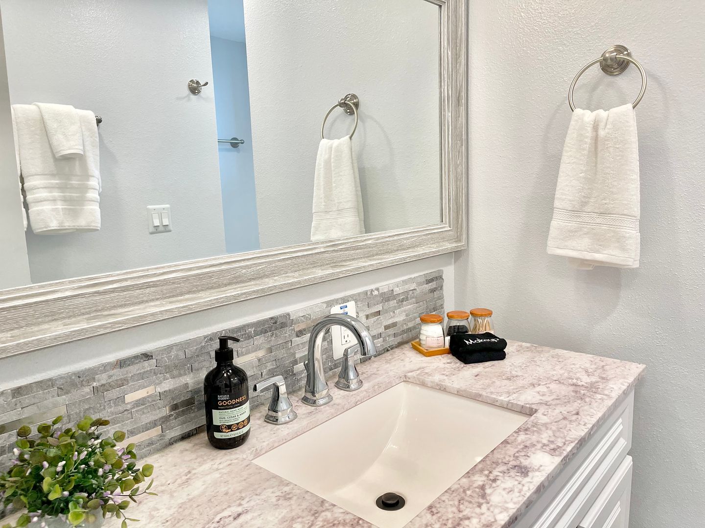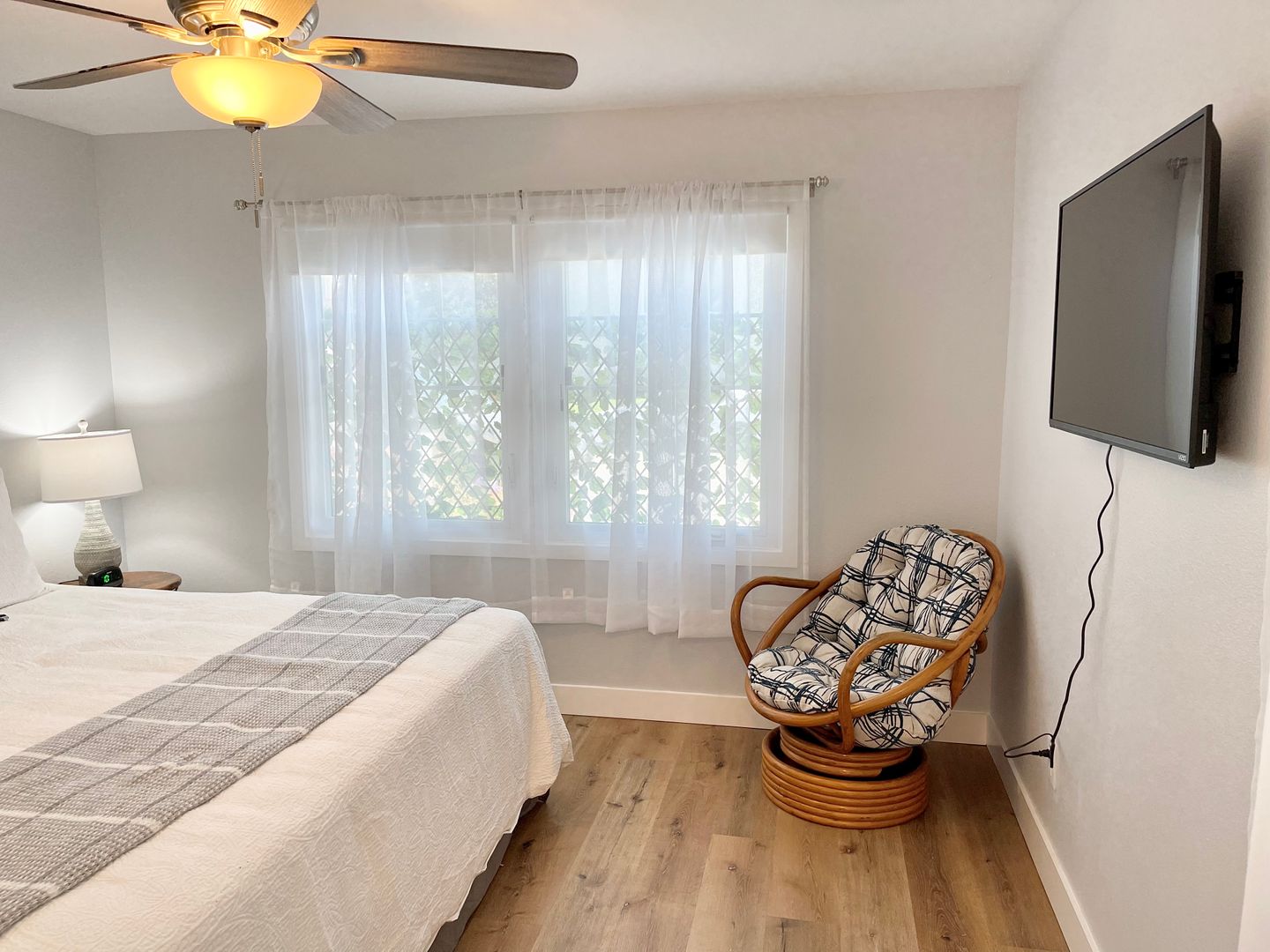 Walk into the home to be greeted by the tastefully decorated living room, equipped with plenty of seating, and a flat screen tv. Find seating for three at the kitchen bar, that leads into the spacious kitchen. The kitchen is newly updated with a brand new backsplash, and beautiful cabinets that are filled with all sorts of cookware. The kitchen provides plenty of room for cooking, and is home to the cutest dining table for two. This table will offer the perfect spot to enjoy your coffee everyday in the morning sunlight!