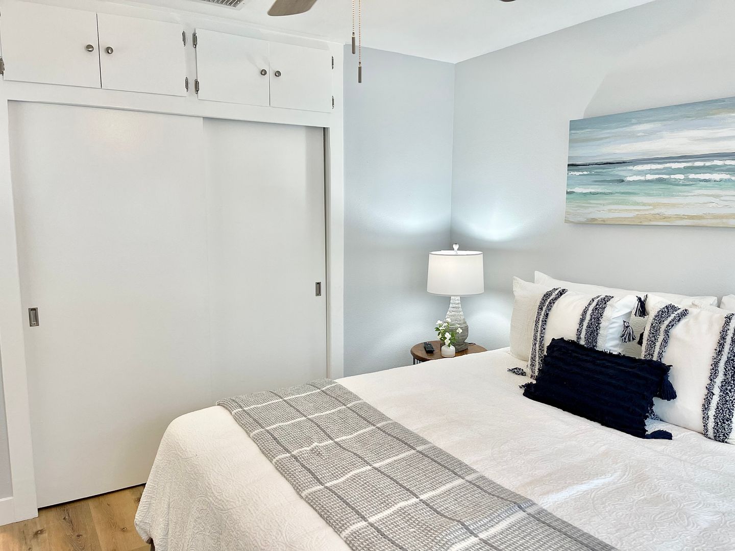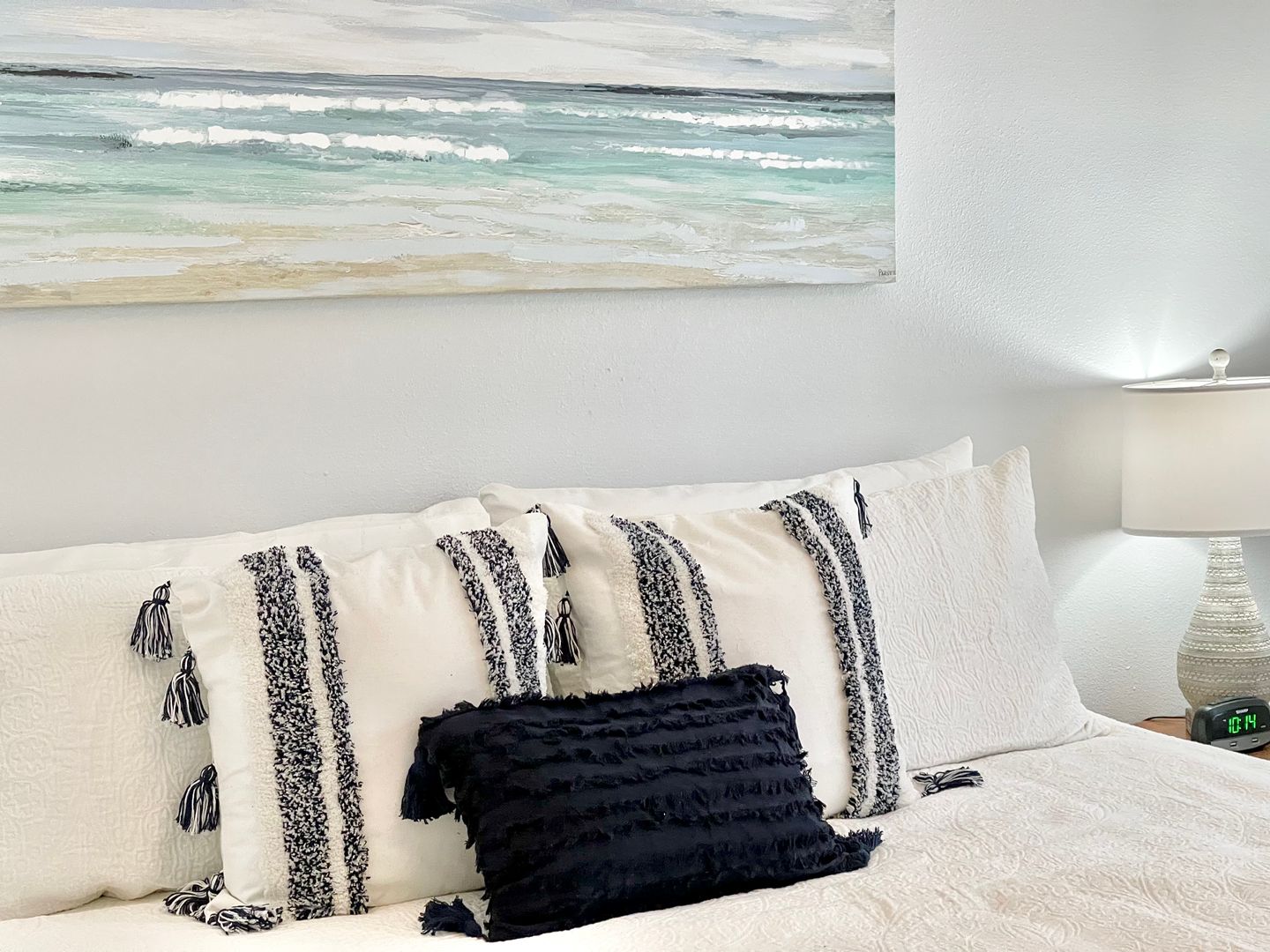 The three bedrooms all offer luxury beach décor, and accommodations for two, sleeping up to six people total! The two full bathrooms are spacious, and one is an en-suite to the large master bedroom.
