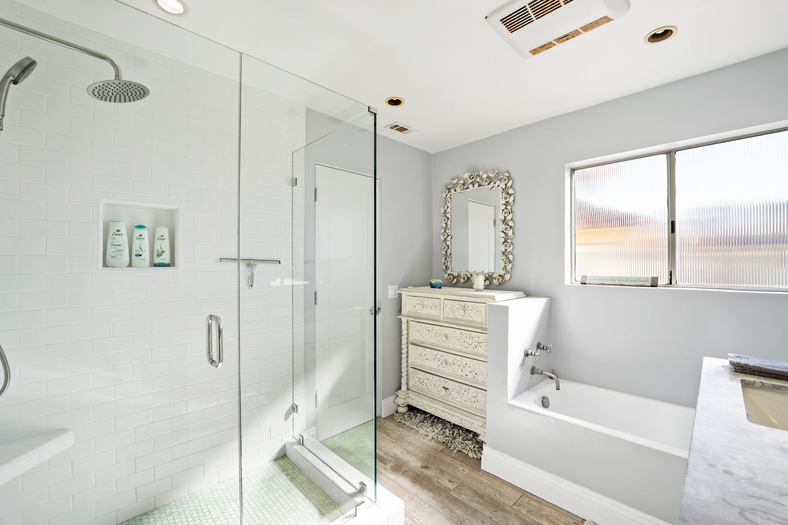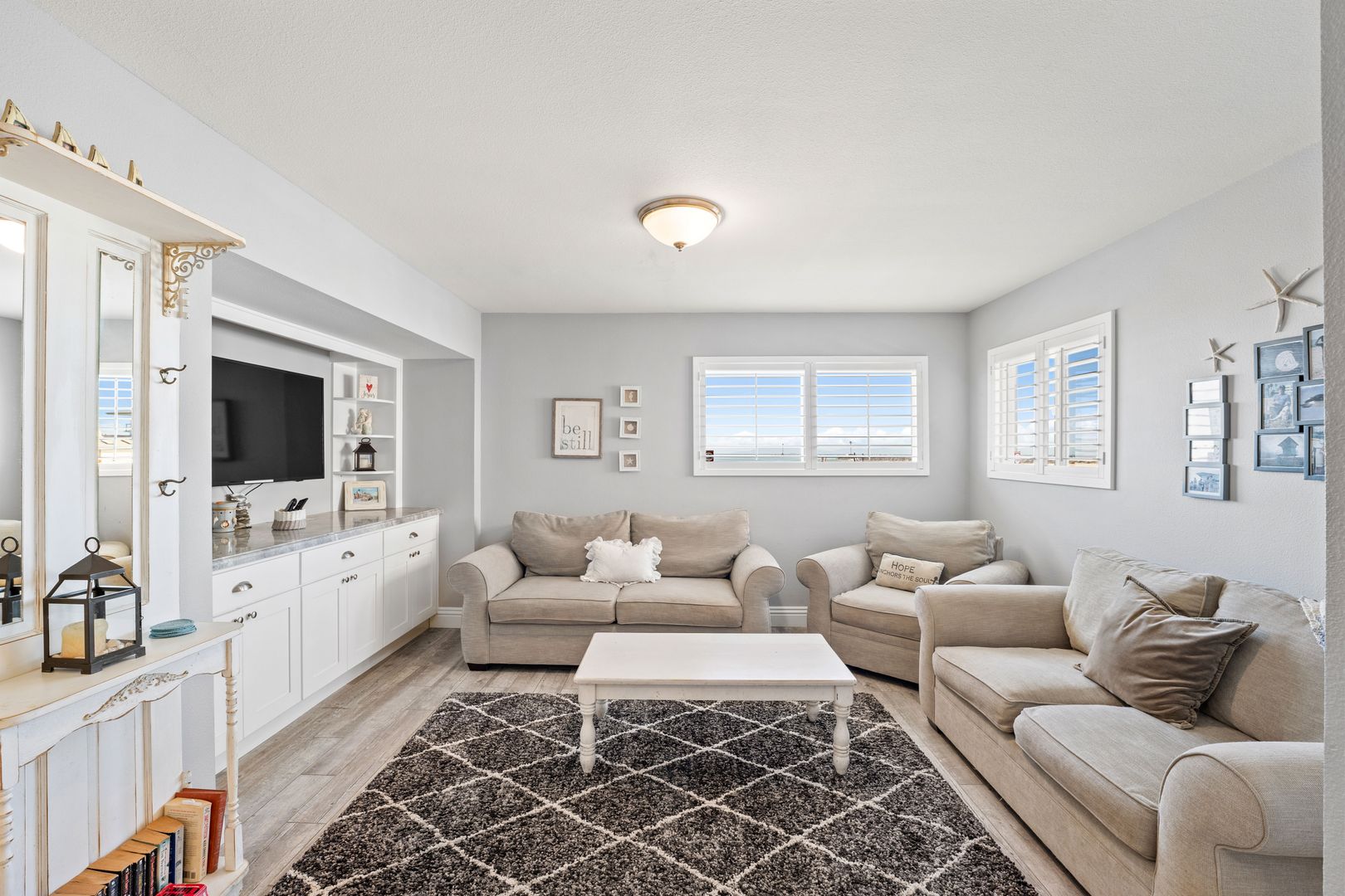 On this main level, you’ll find two inviting bedrooms and a bathroom featuring a walk-in shower, tub, and vanity—perfect for relaxation after a day of beach fun.