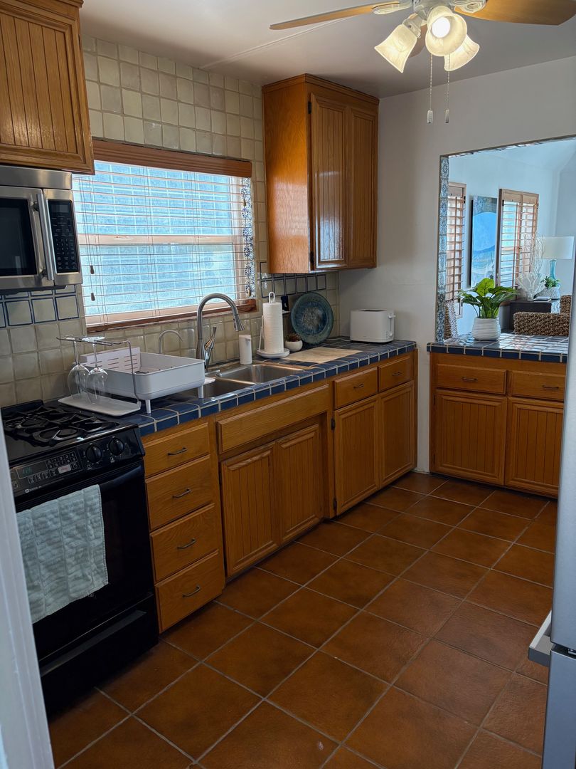 Fully equipped kitchen with gas range, microwave and fridge