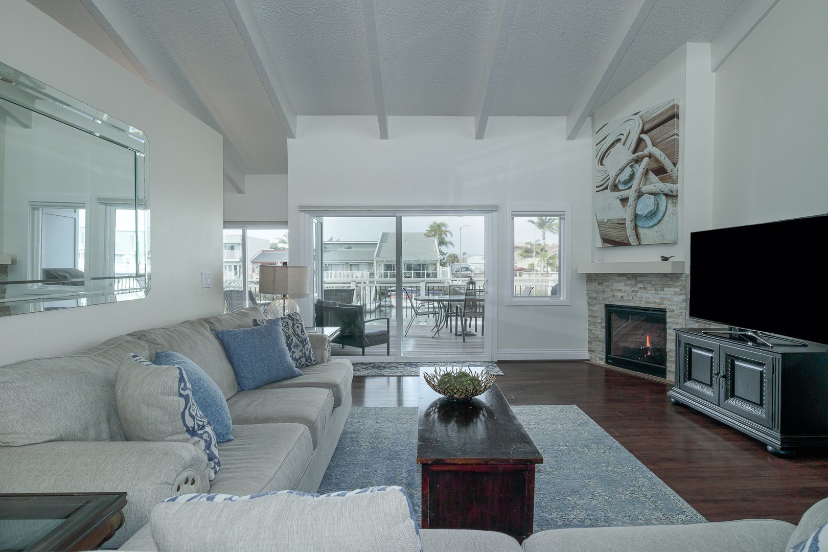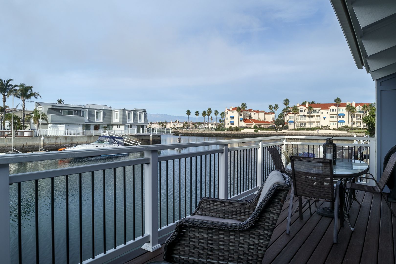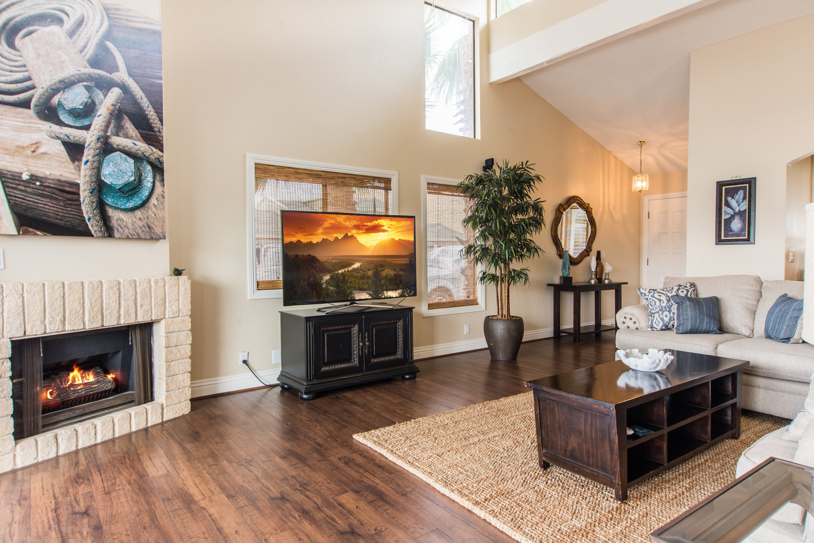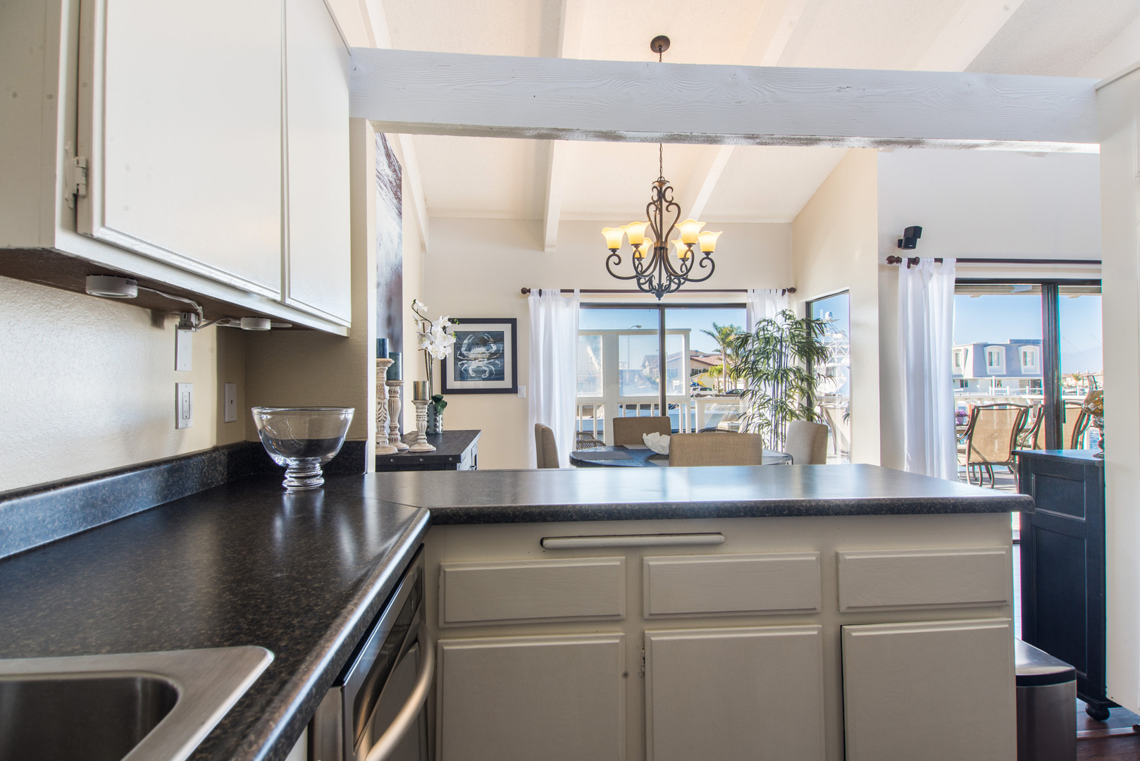 Gorgeous single-story, two bedroom two bathroom, boat dock home. The first thing that meets your eye when you open the door of this beautiful home, is the stunning hard wood flooring in a tastefully decorated open living space that boasts a 60 inch flat screen TV with game console and wifi. The lovely furnishings throughout the home give a sense of relaxation the moment you enters, and the boat dock accessible dining/ sitting area on the patio expands the feel of relaxation at the sea. Boat not included.