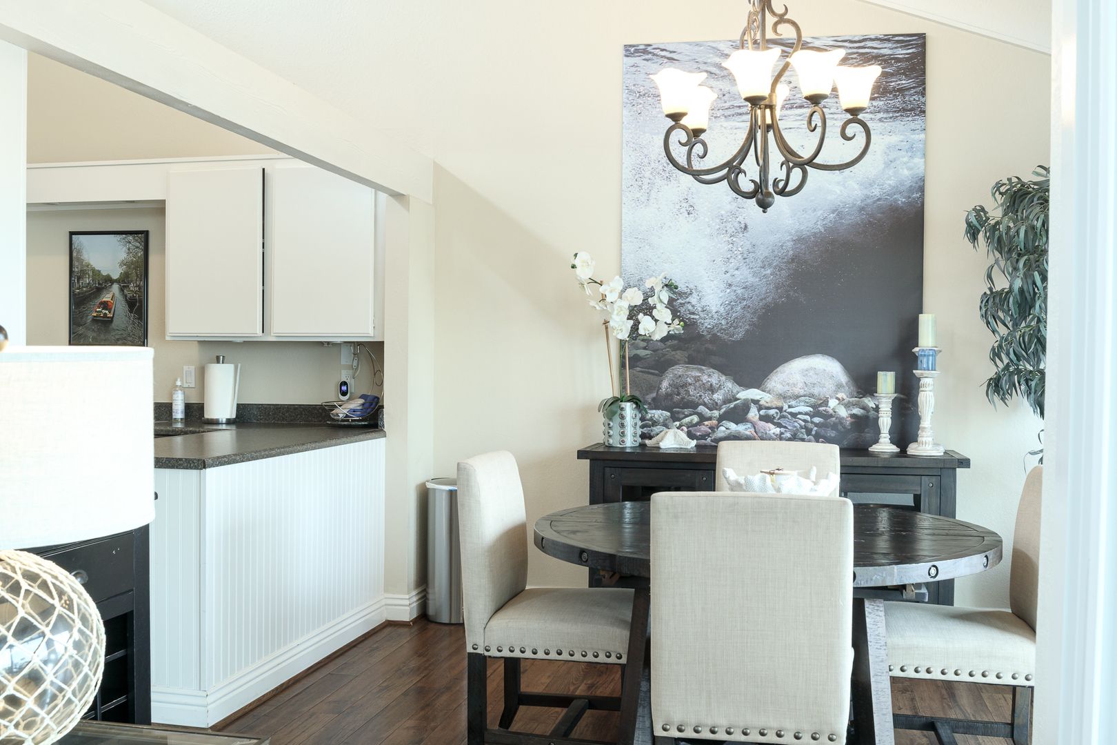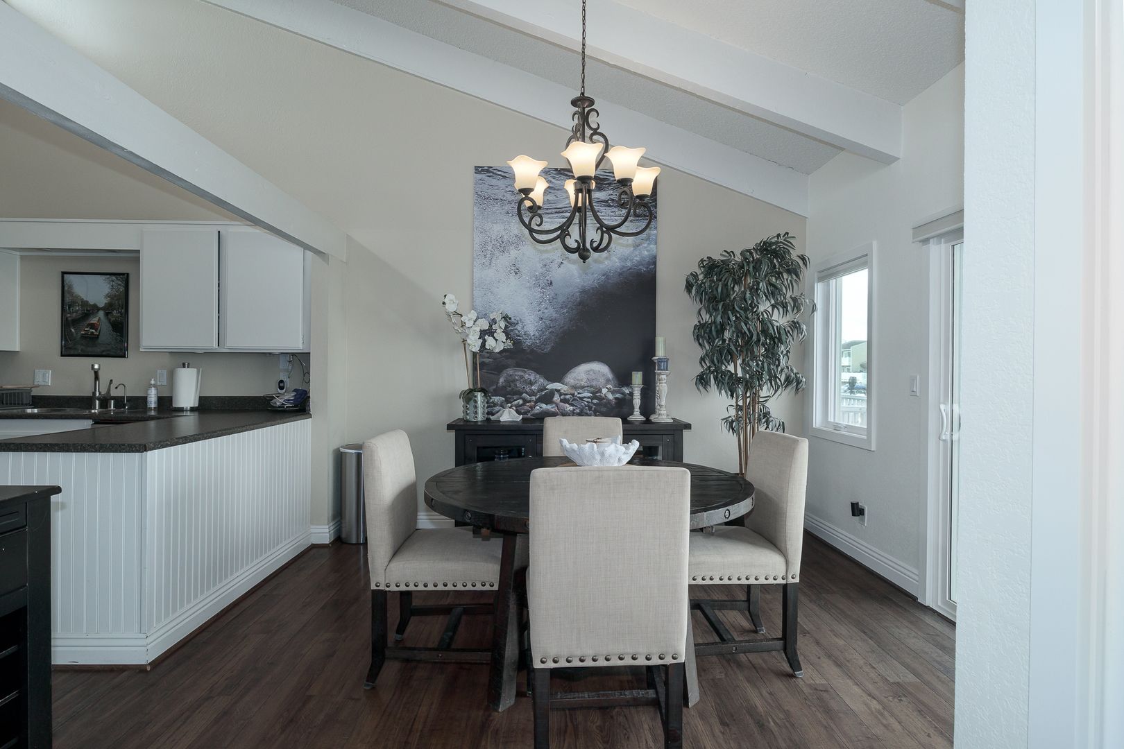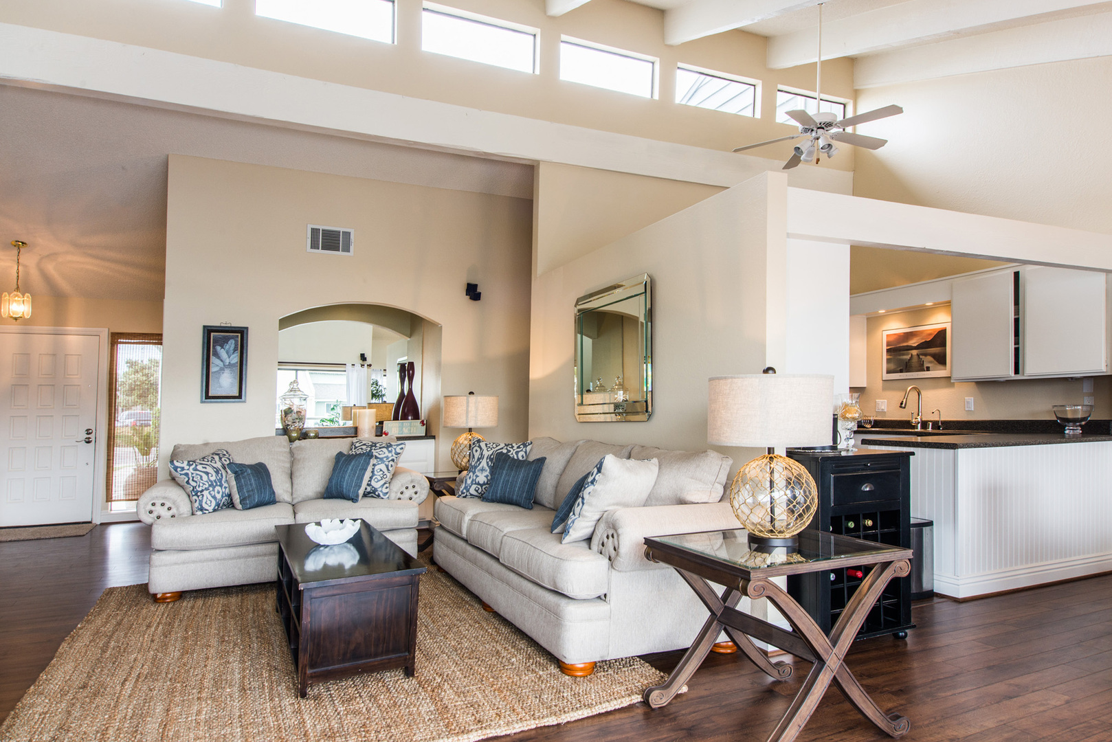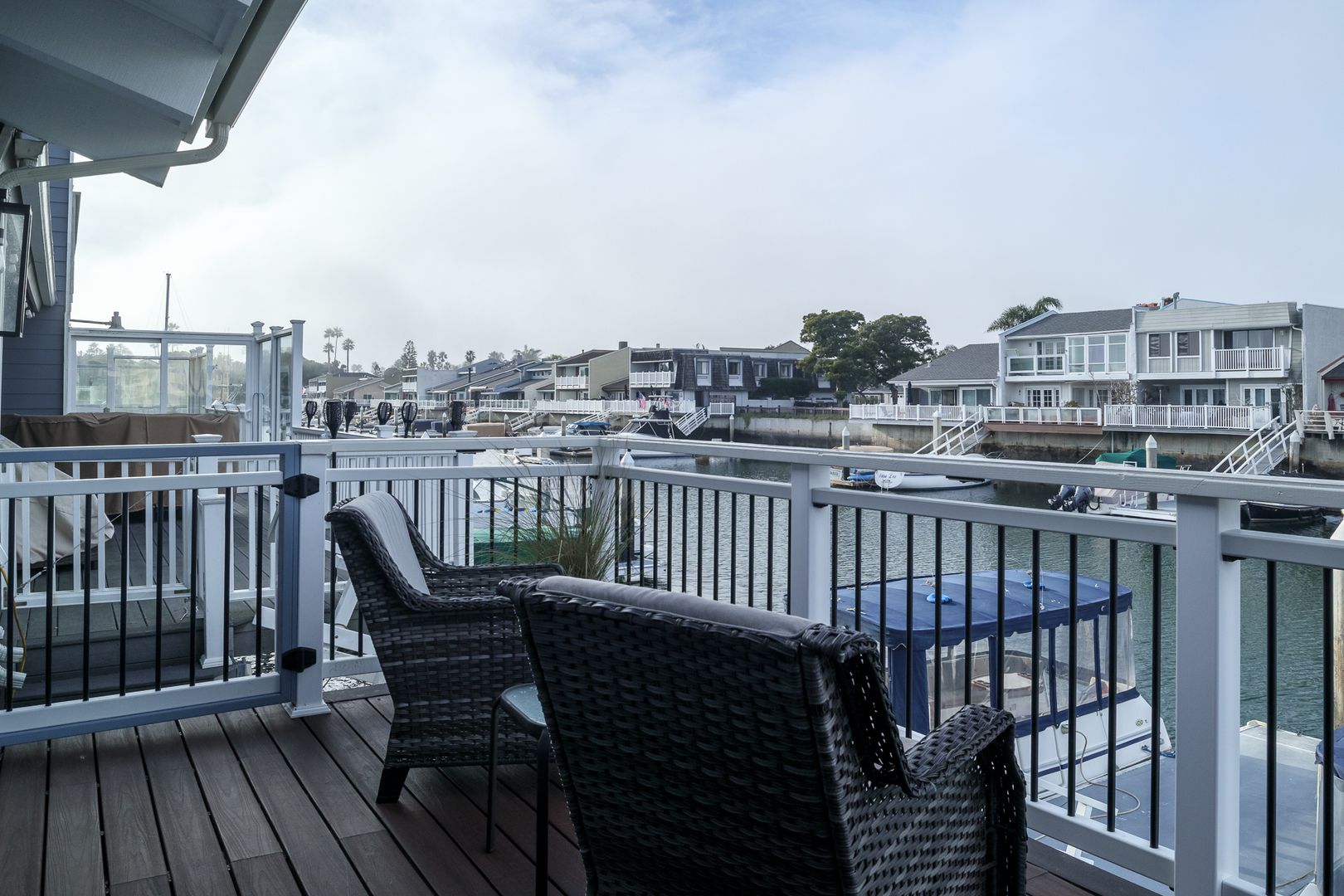 Gorgeous single-story, two bedroom two bathroom, boat dock home. The first thing that meets your eye when you open the door of this beautiful home, is the stunning hard wood flooring in a tastefully decorated open living space that boasts a 60 inch flat screen TV with game console and wifi. The lovely furnishings throughout the home give a sense of relaxation the moment you enters, and the boat dock accessible dining/ sitting area on the patio expands the feel of relaxation at the sea. Boat not included.