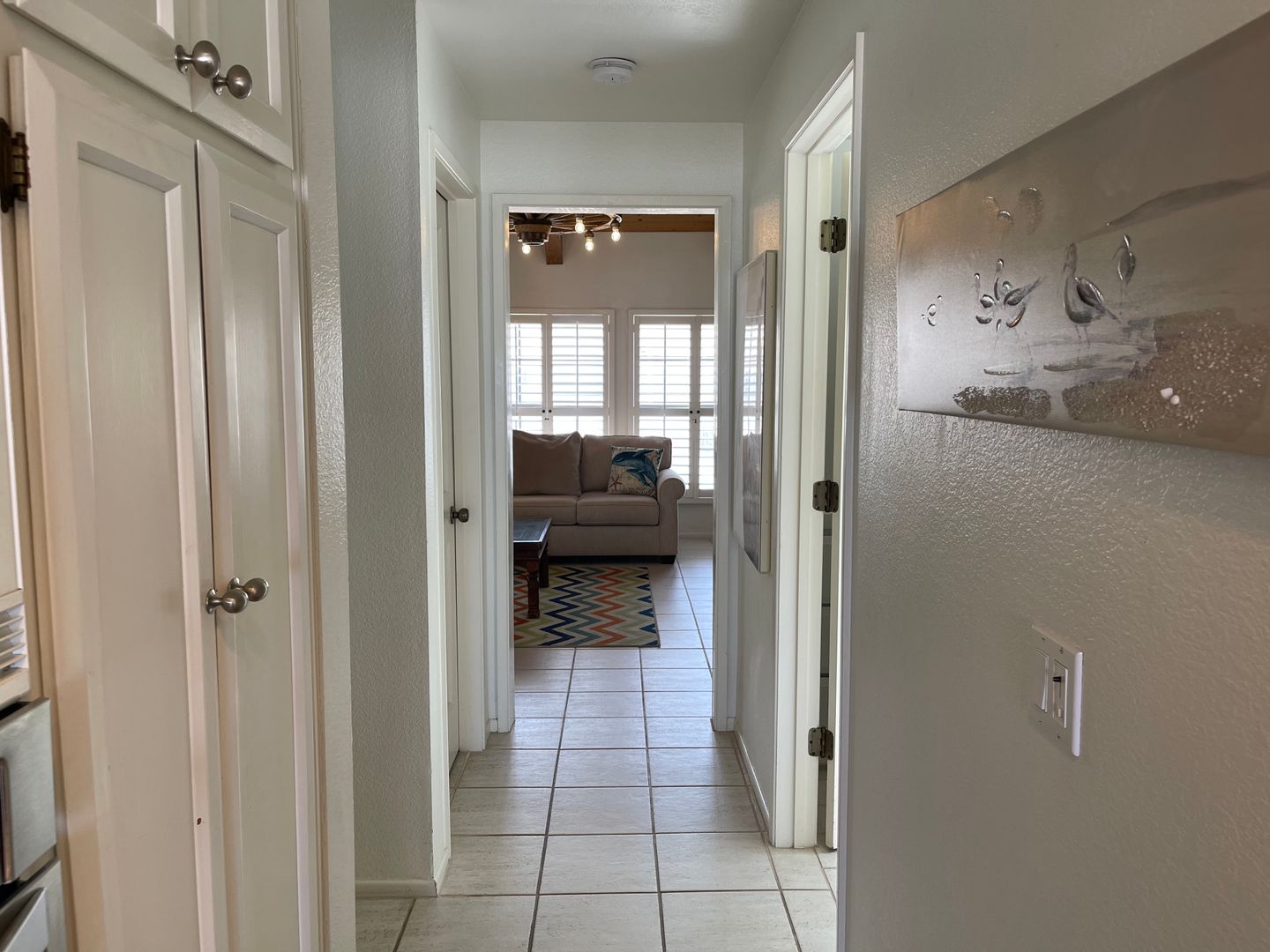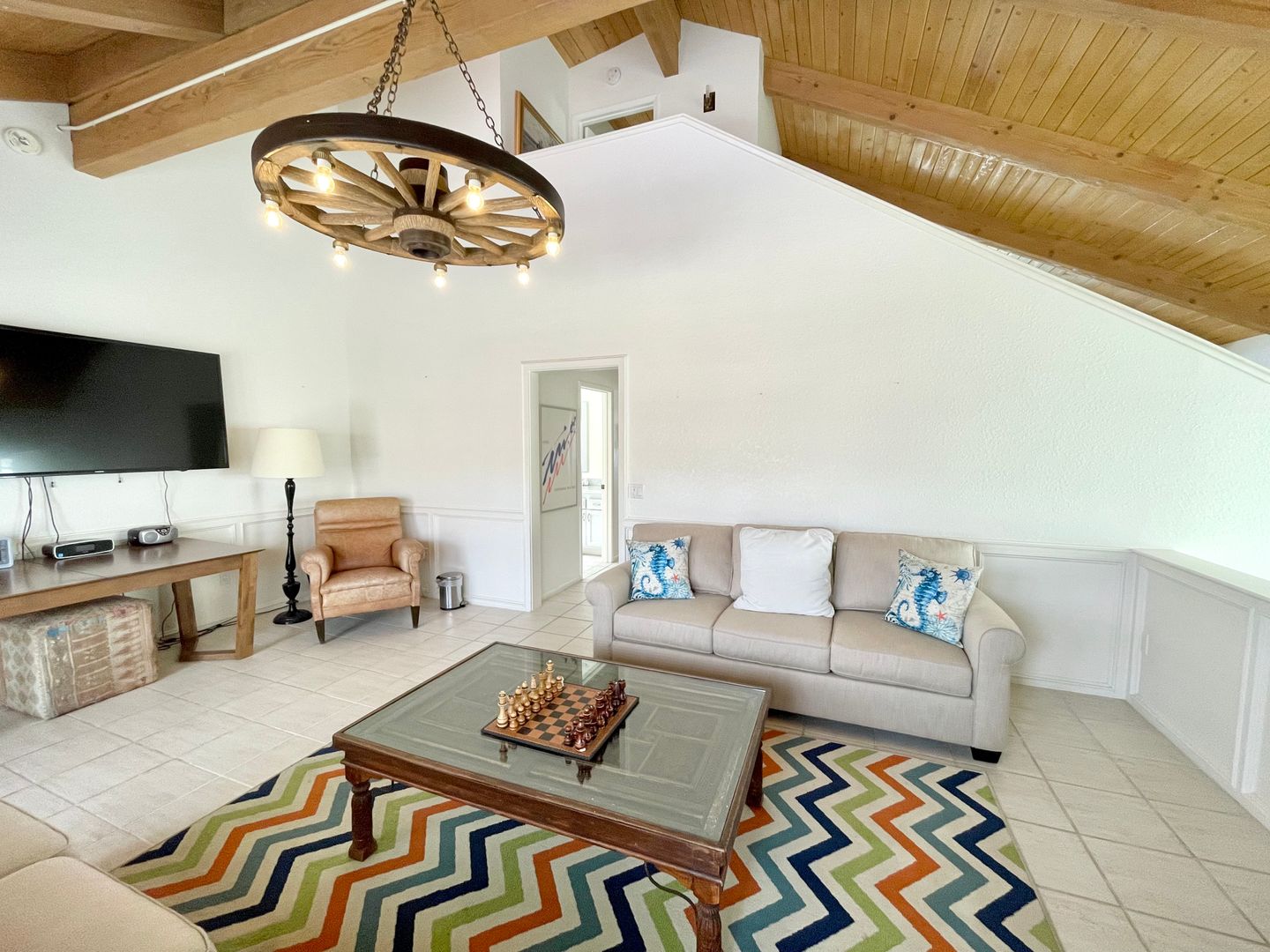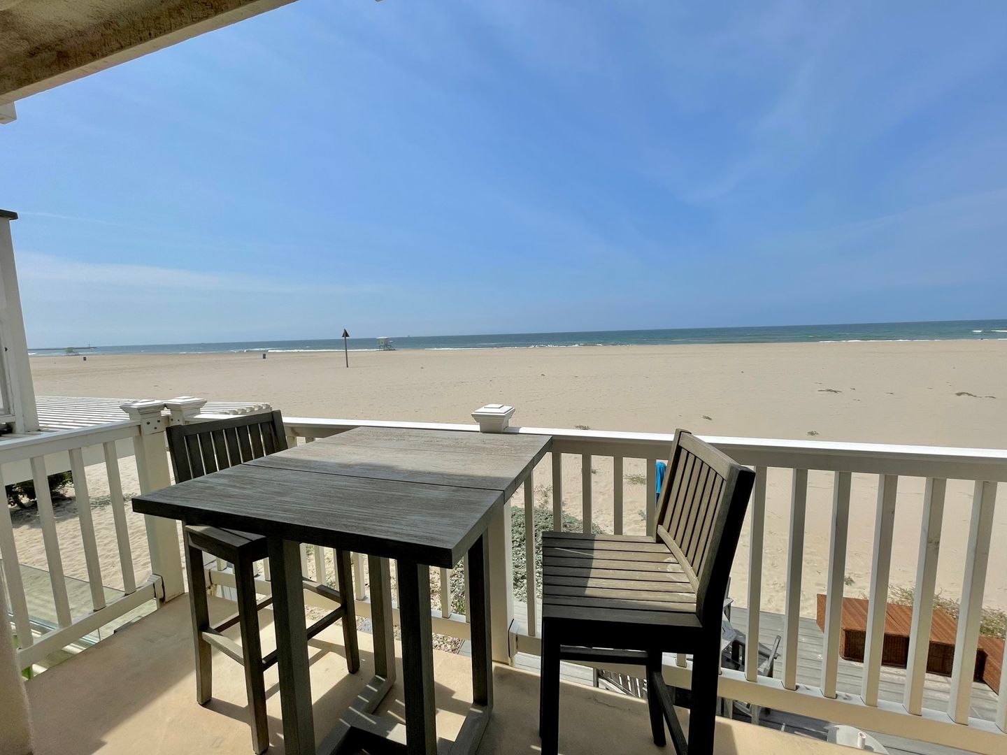 On the second floor you are greeted with a fabulous view of a huge, largely unoccupied sandy beach, the blue sky, the ocean and on a clear day, the Channel Islands. There is a large living room with a high beamed wood ceiling with new sofas with plenty of seating room and picture windows overlooking the beach. A volleyball net three doors north awaits you. To the south, you see the Ventura County Lifeguard station which is manned by lifeguard personnel from Memorial Day through Labor Day.