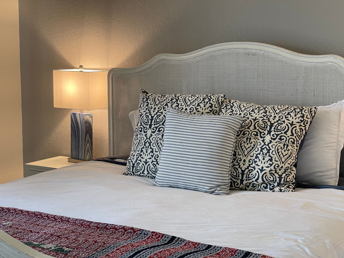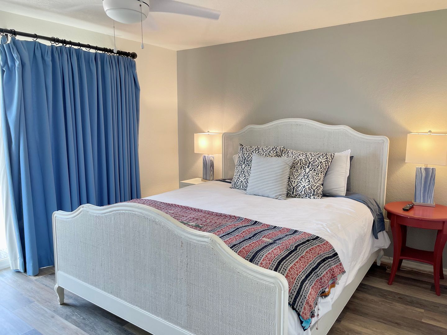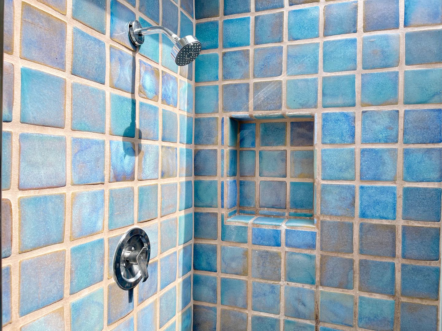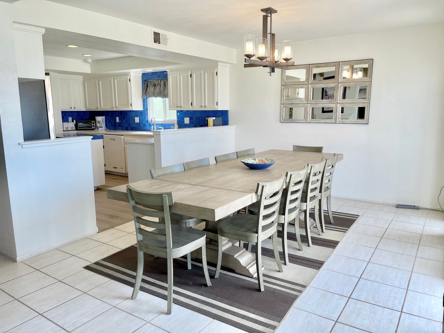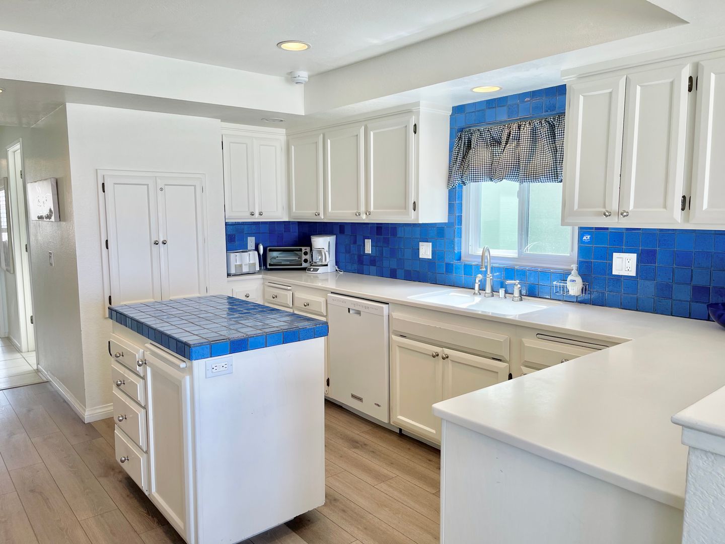 Adjacent to the dining area is a beautiful blue and white tiled kitchen with stainless appliances. This is a chef's delight with plenty of space for preparing meals. We have coffee pots, two toasters, two blenders, and all the tools ready and waiting for that gourmet meal or barbecued hot dogs and hamburgers. The kitchen also has a large supply of condiments and seasonings.