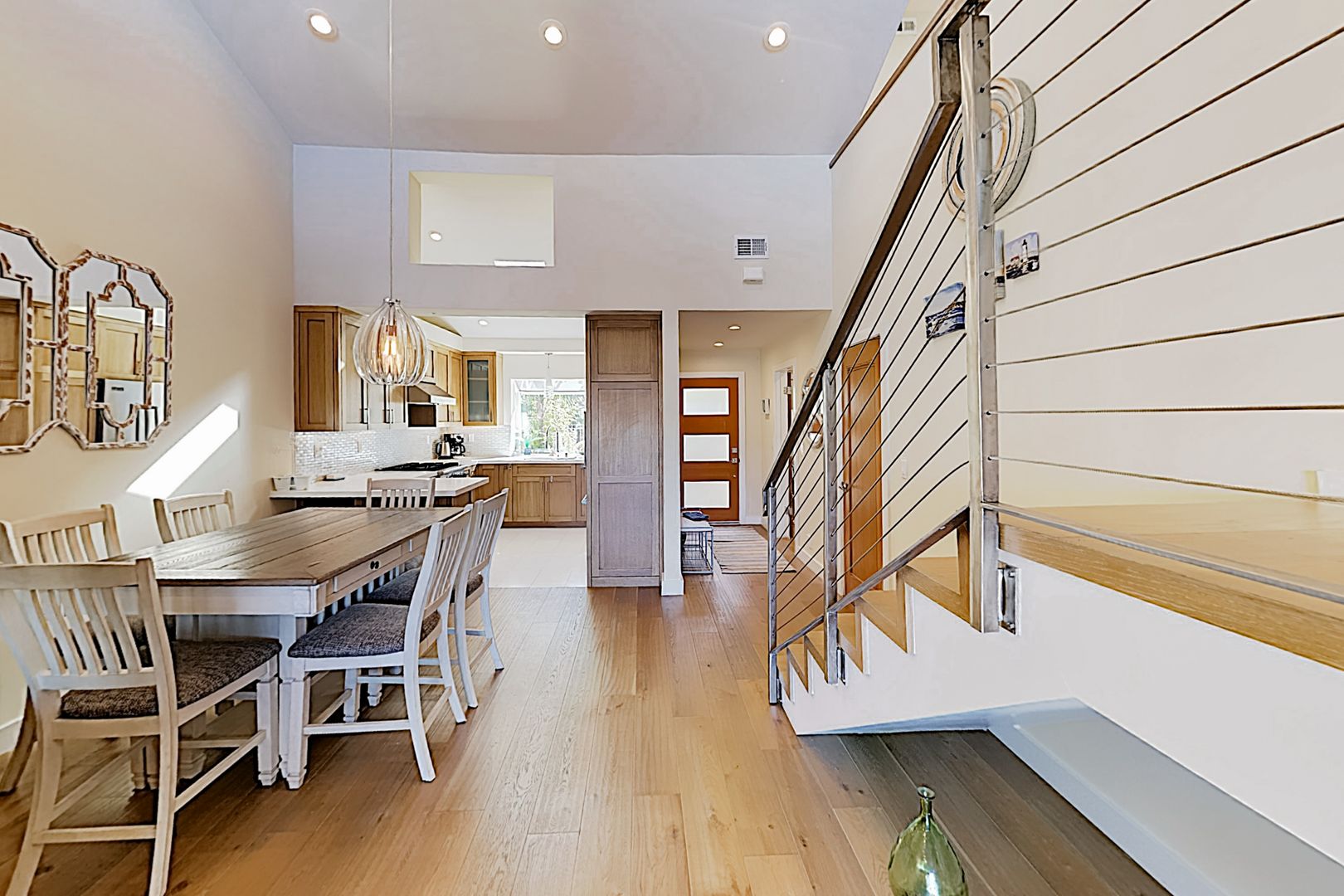 The first floor living area offers a sofa, two easy chairs, a 75” smart TV and stunning views of the water. A double-sided gas fireplace sits in between the living and dining areas. The bright kitchen features stainless steel Viking appliances including a side by side fridge and a gas range. The dining table has room enough for six.