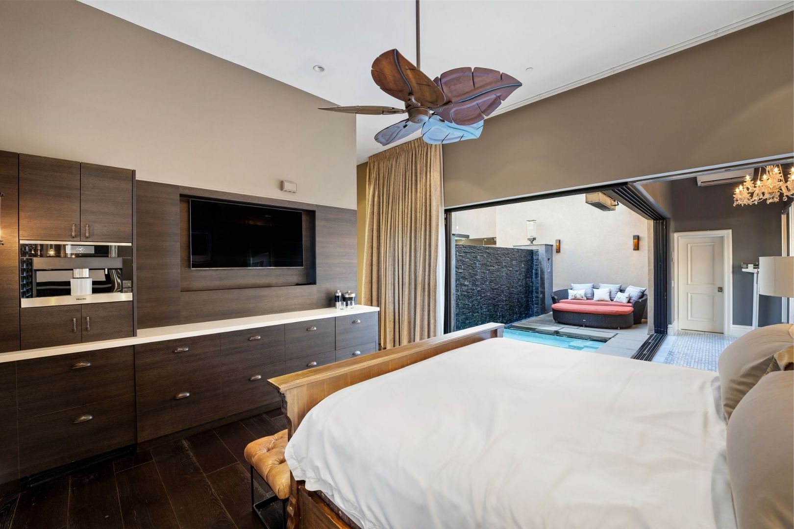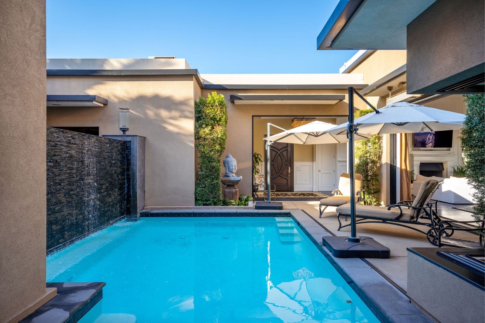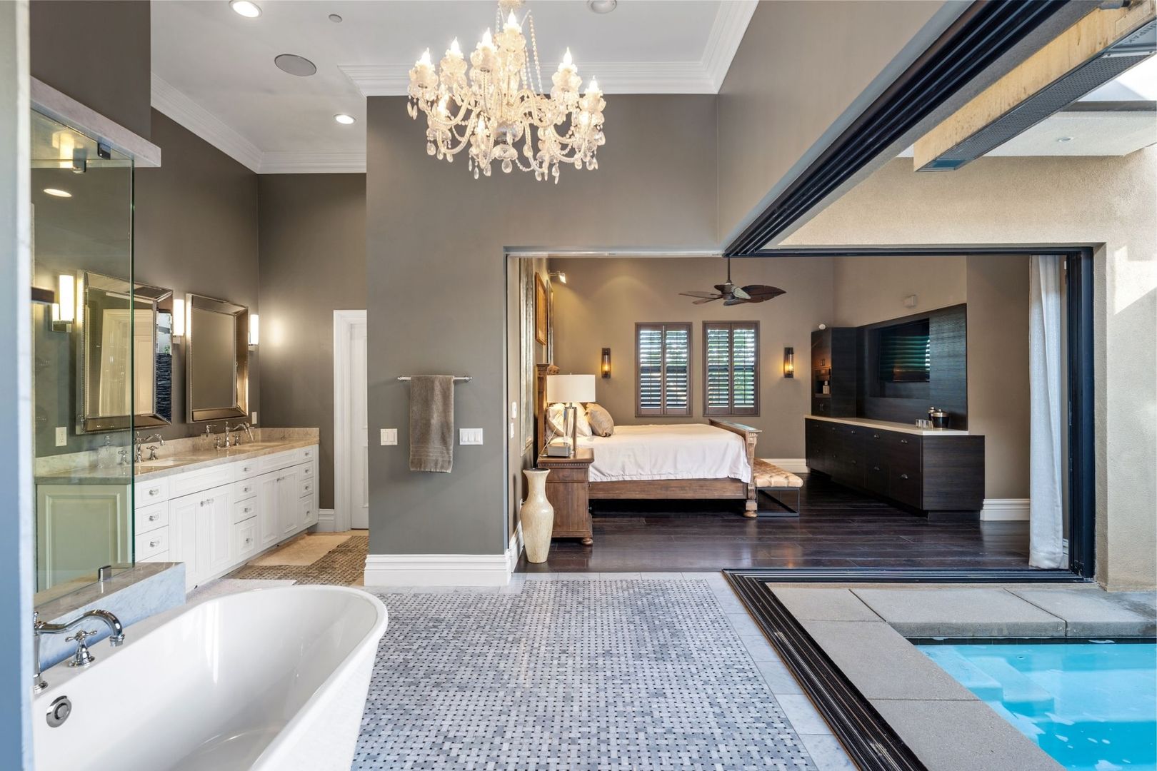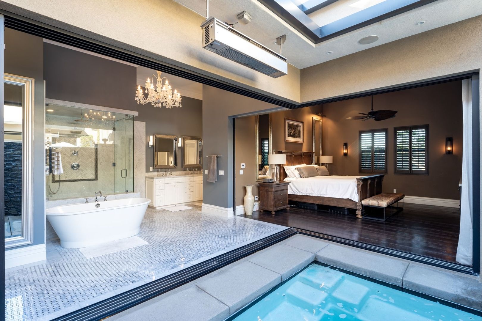 The primary bedroom is a true retreat, offering a California king-sized bed and an en suite bathroom equipped with a luxurious tub, walk-in shower, and dual vanity. Enjoy seamless access to the private pool and spa from the entire home, creating an ideal setting for relaxation and entertaining.