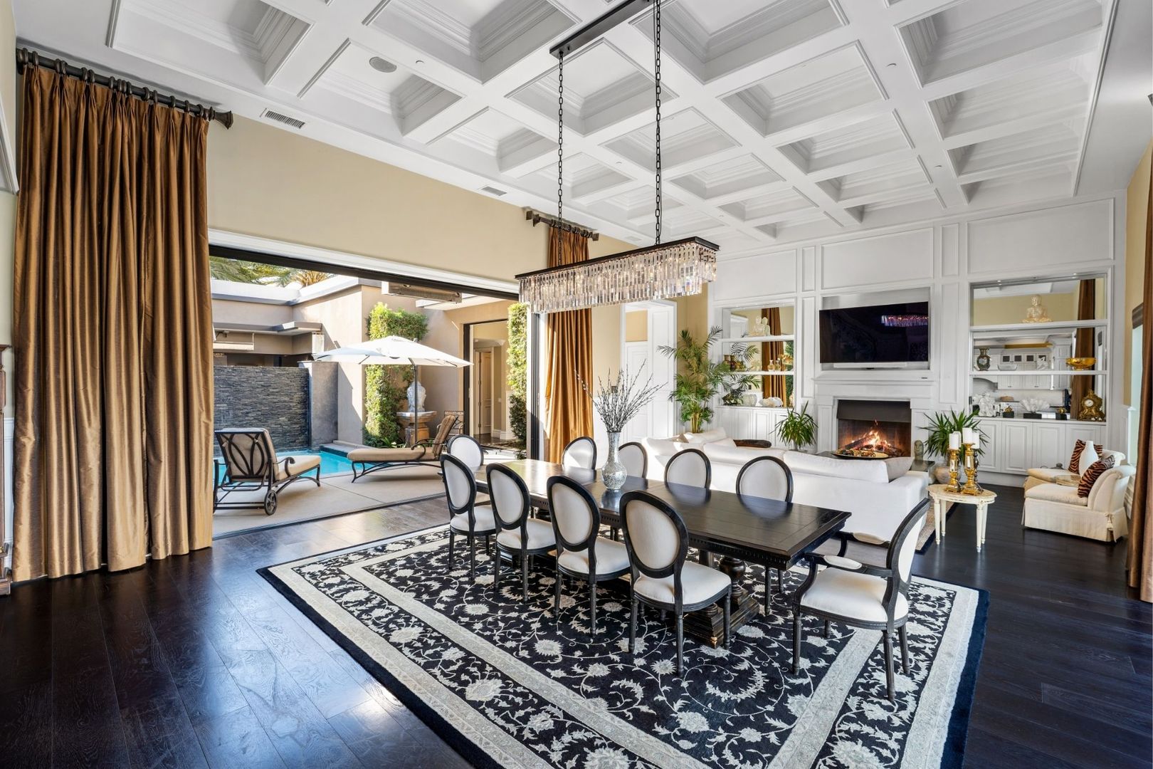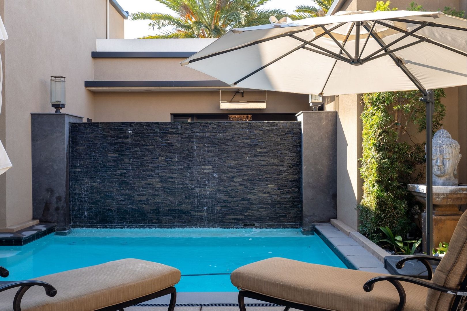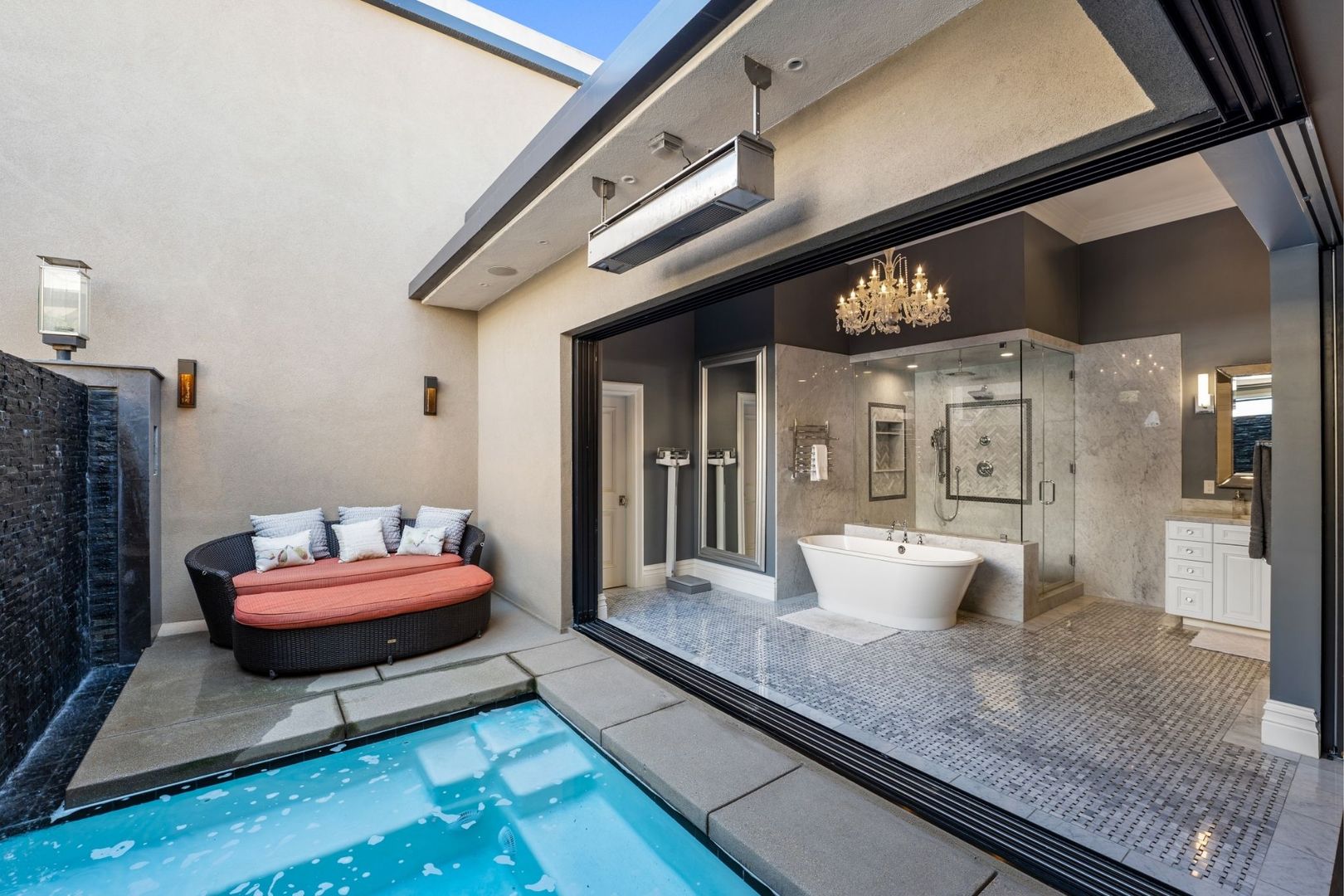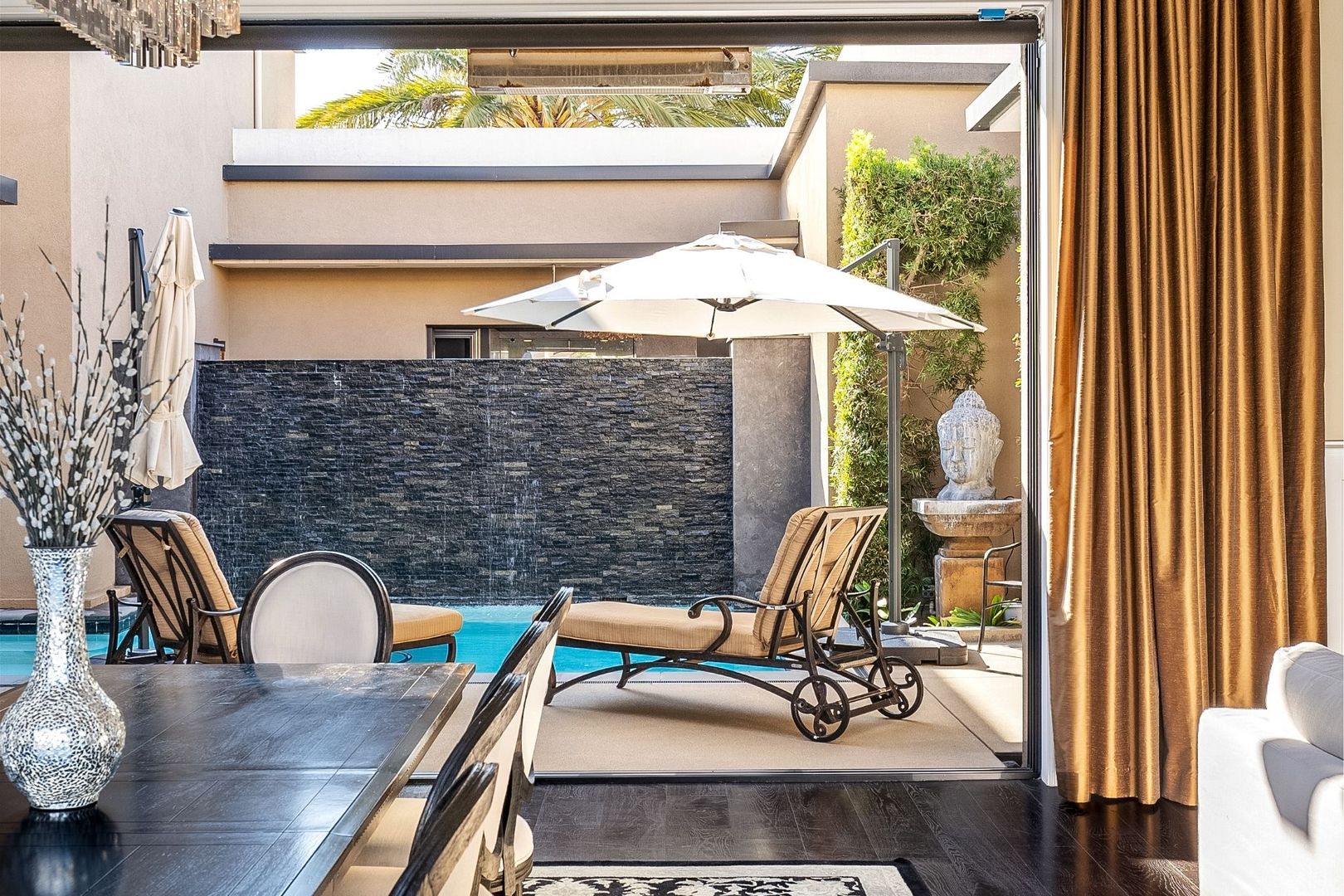 The primary bedroom is a true retreat, offering a California king-sized bed and an en suite bathroom equipped with a luxurious tub, walk-in shower, and dual vanity. Enjoy seamless access to the private pool and spa from the entire home, creating an ideal setting for relaxation and entertaining.