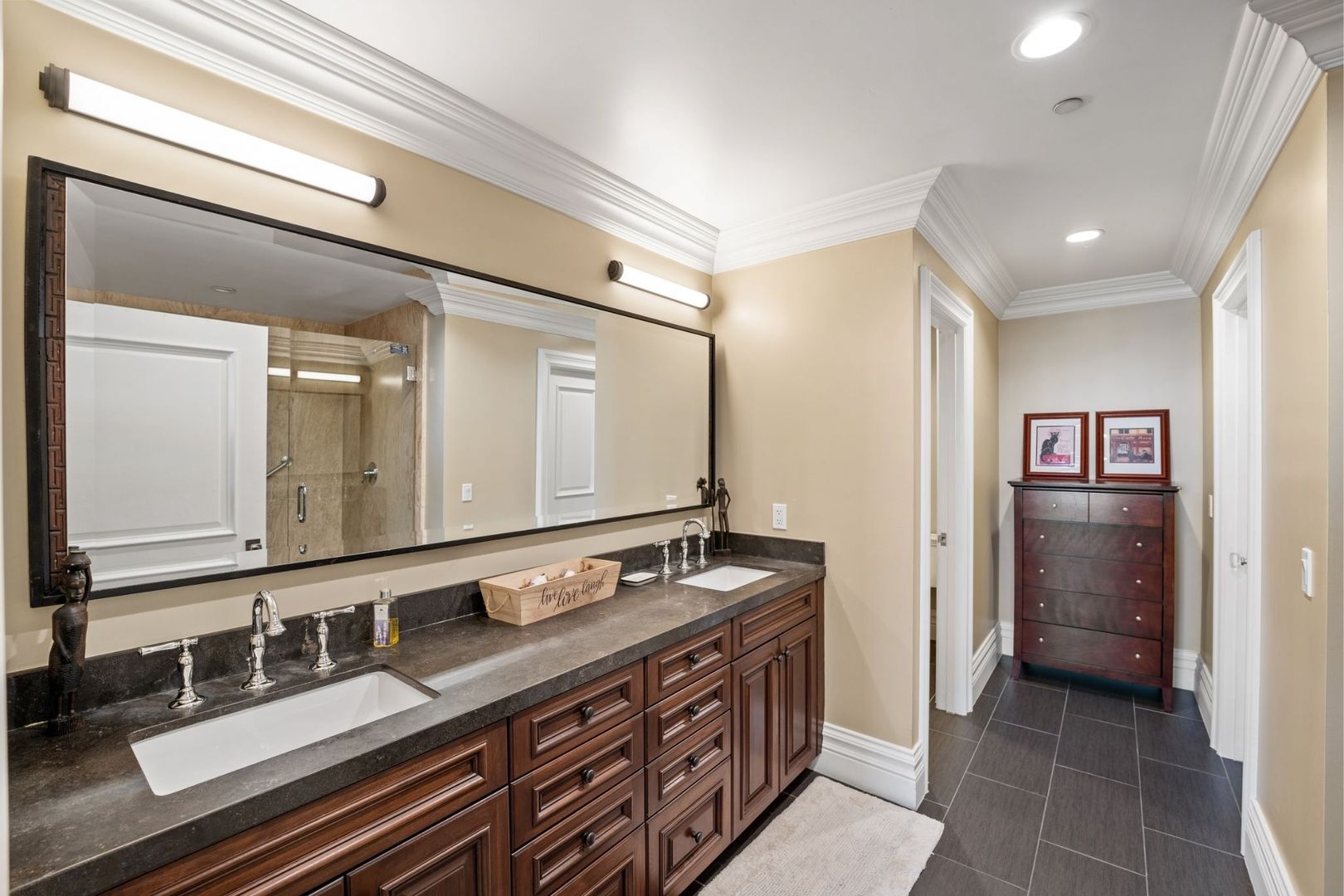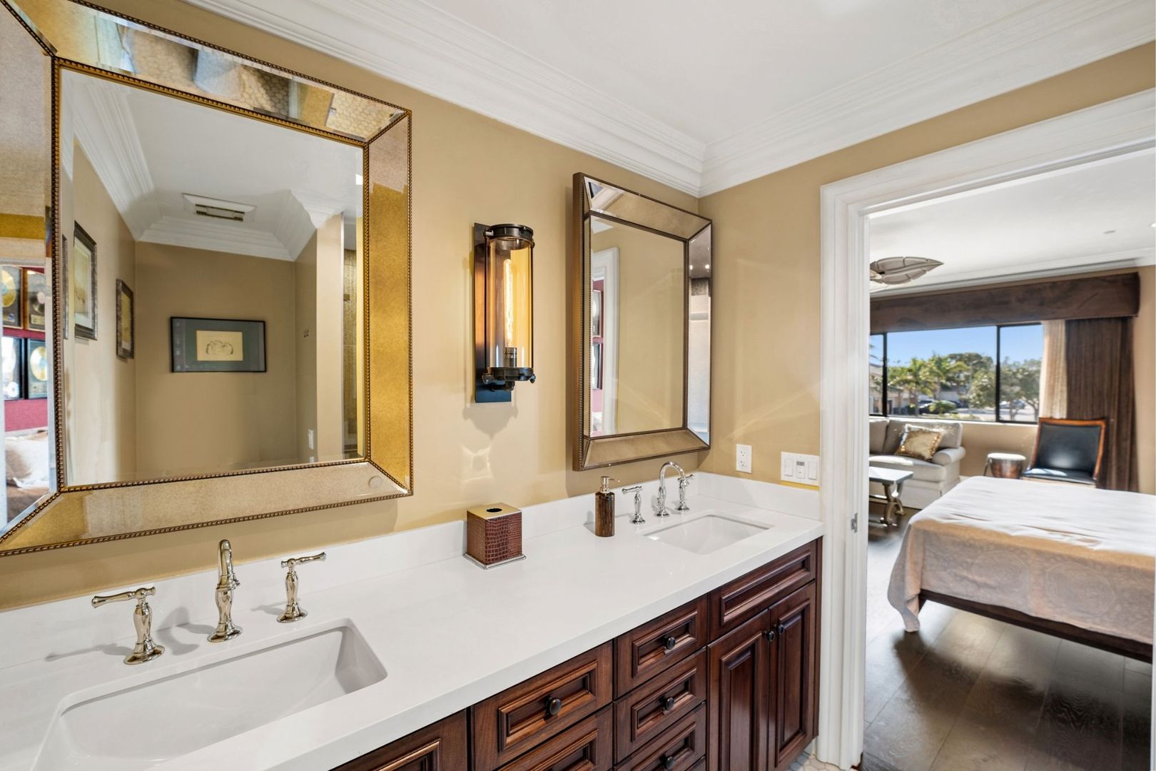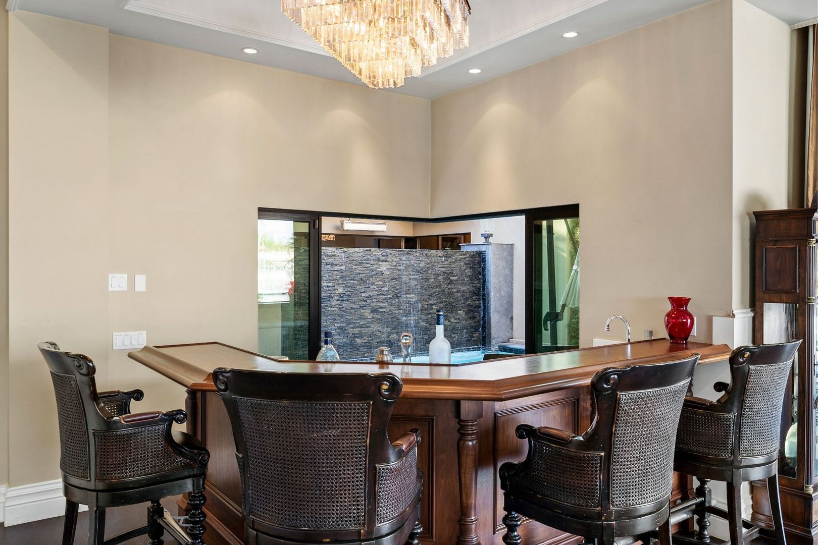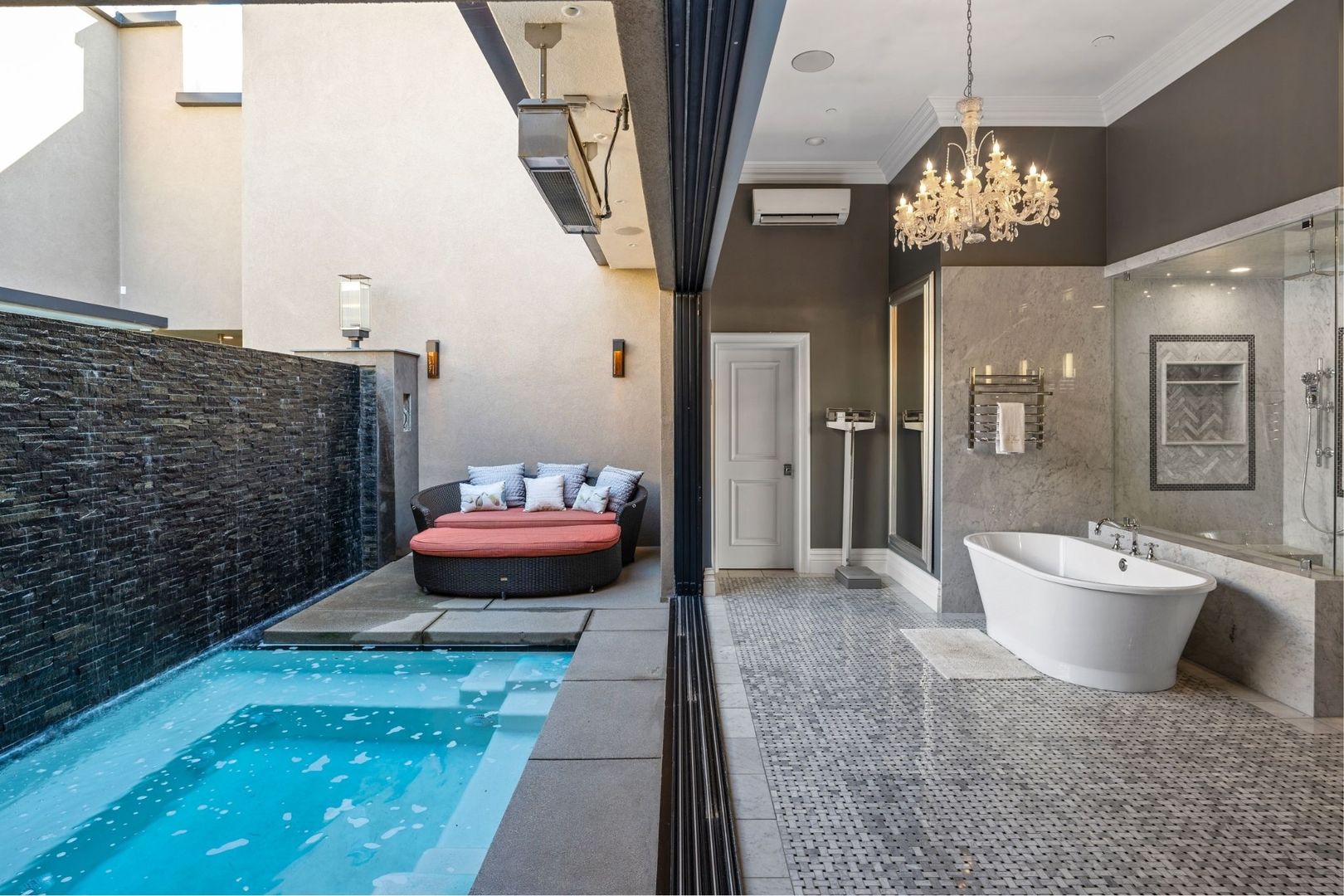 The primary bedroom is a true retreat, offering a California king-sized bed and an en suite bathroom equipped with a luxurious tub, walk-in shower, and dual vanity. Enjoy seamless access to the private pool and spa from the entire home, creating an ideal setting for relaxation and entertaining.