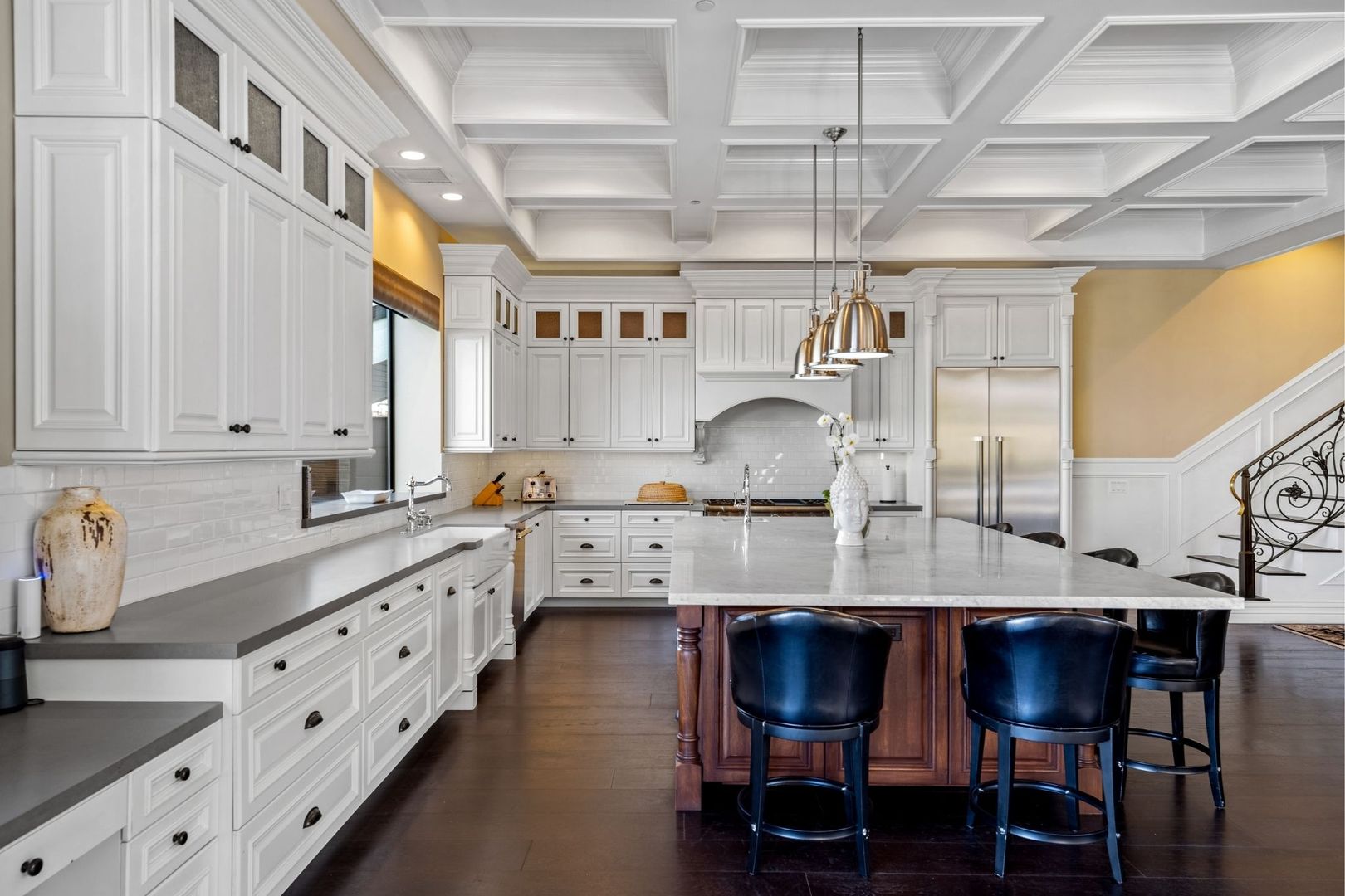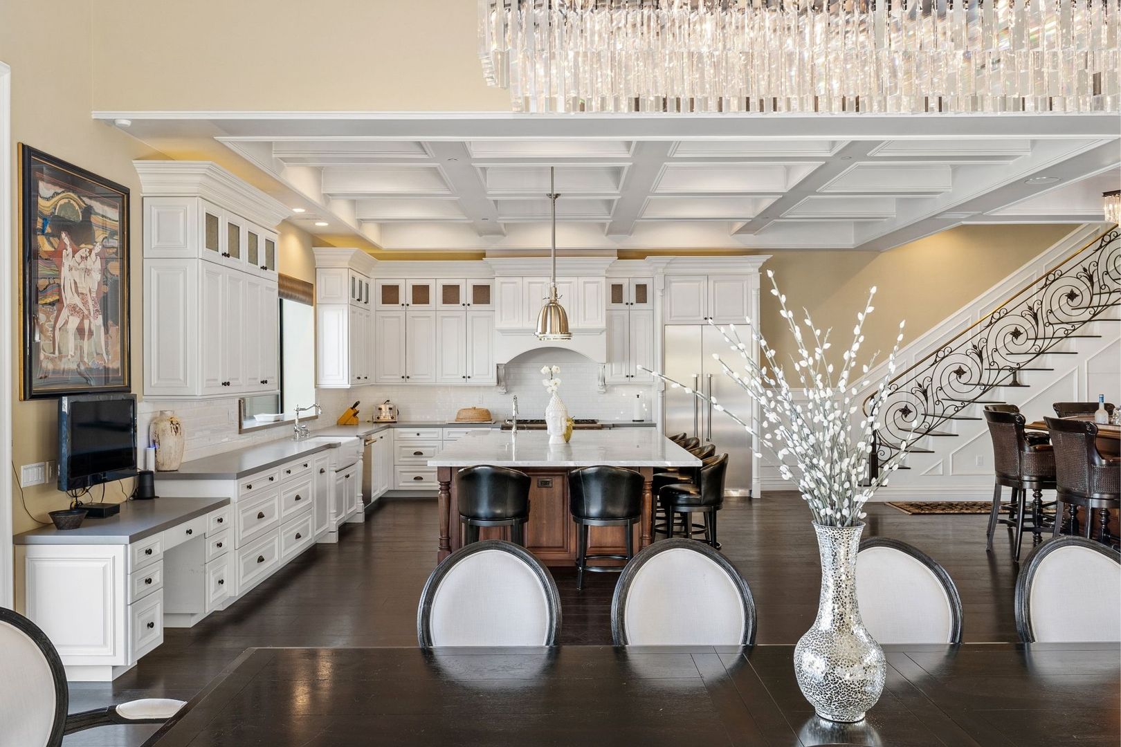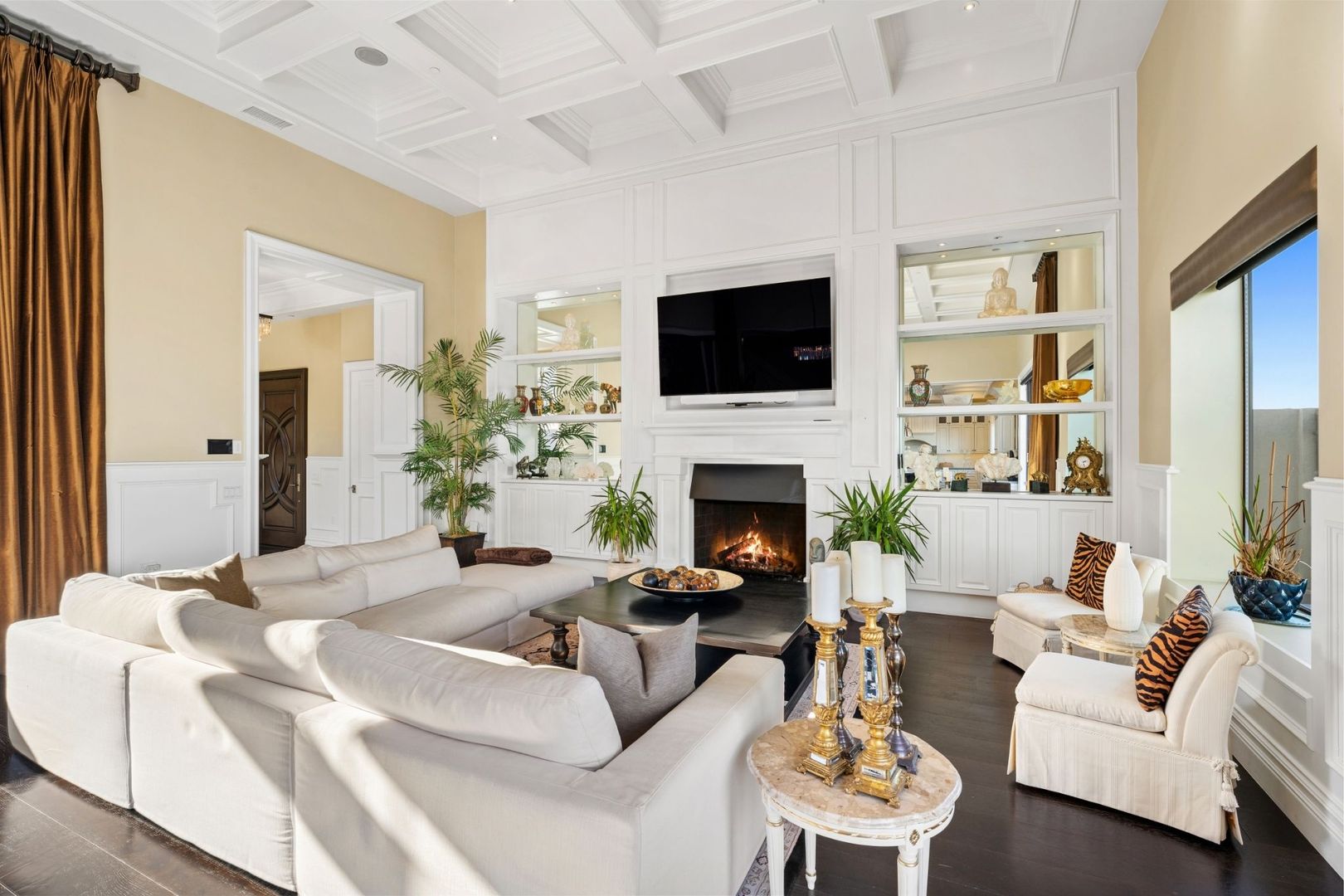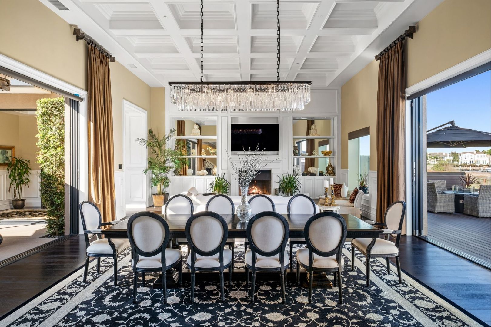 Step into the open-concept living area, where floor-to-ceiling glass windows invite natural light and showcase the picturesque harbor. The kitchen is a chef’s dream, adorned with beautiful white cabinetry that perfectly complements the space. The living room features 15-foot ceilings and elegant built-ins flanking the fireplace, adding a touch of sophistication.