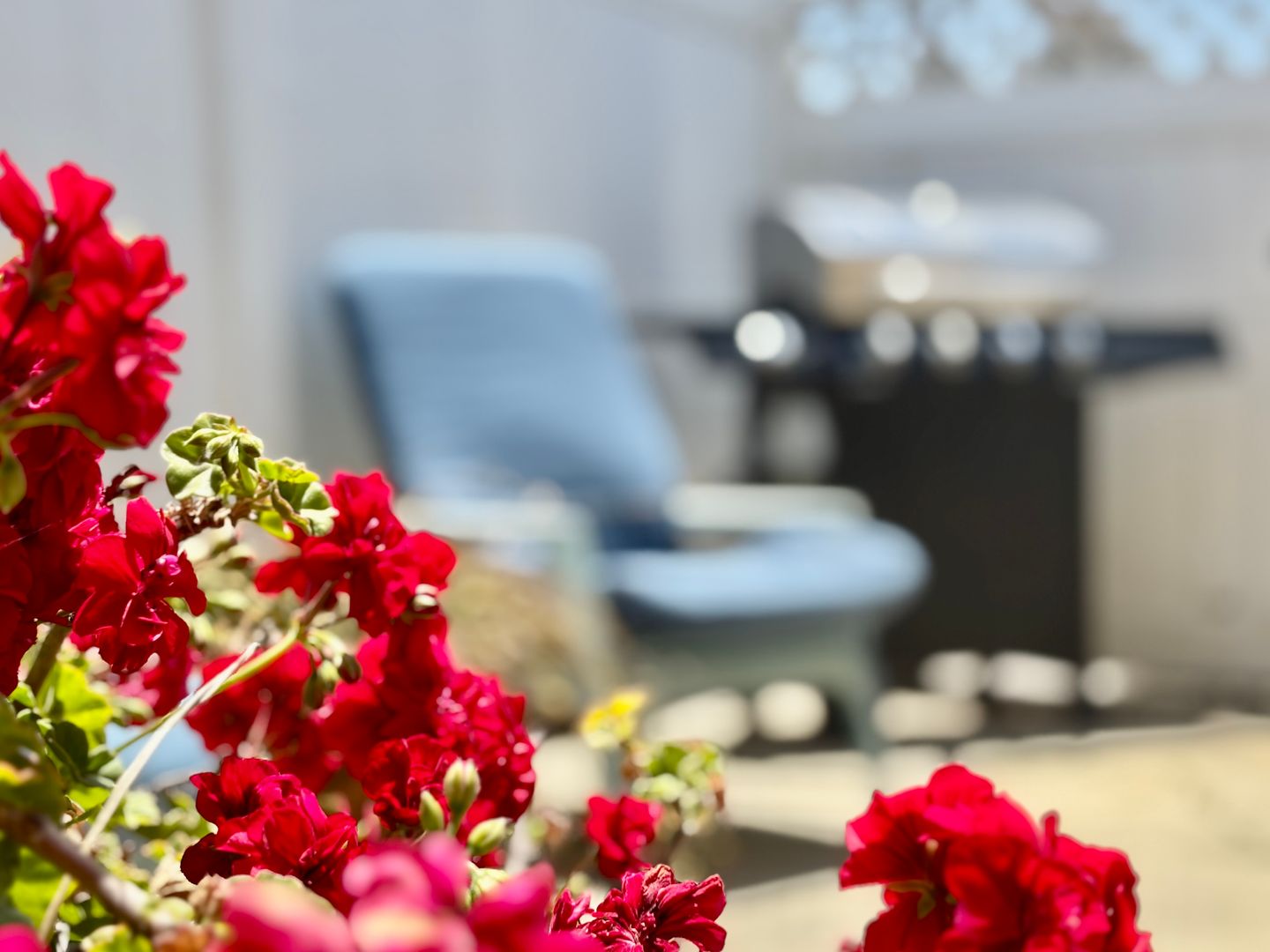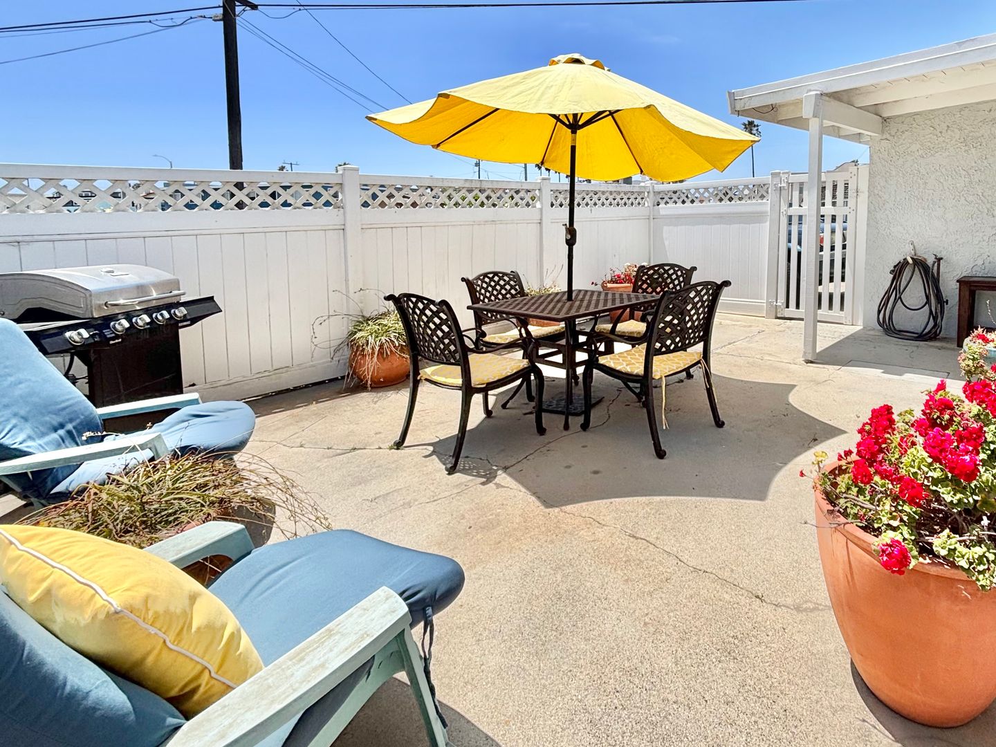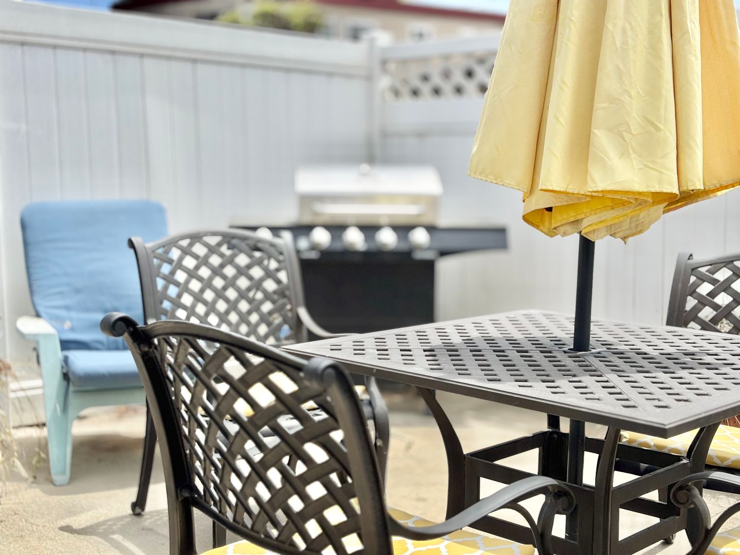 Spacious front patio with BBQ grill and ample seating — perfect for outdoor dining or lounging after a day in the sun