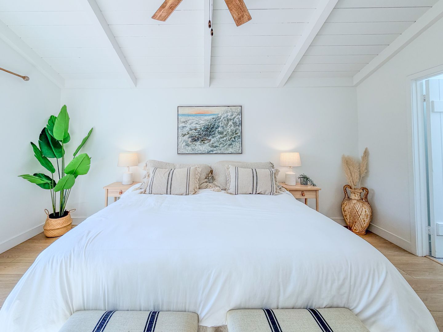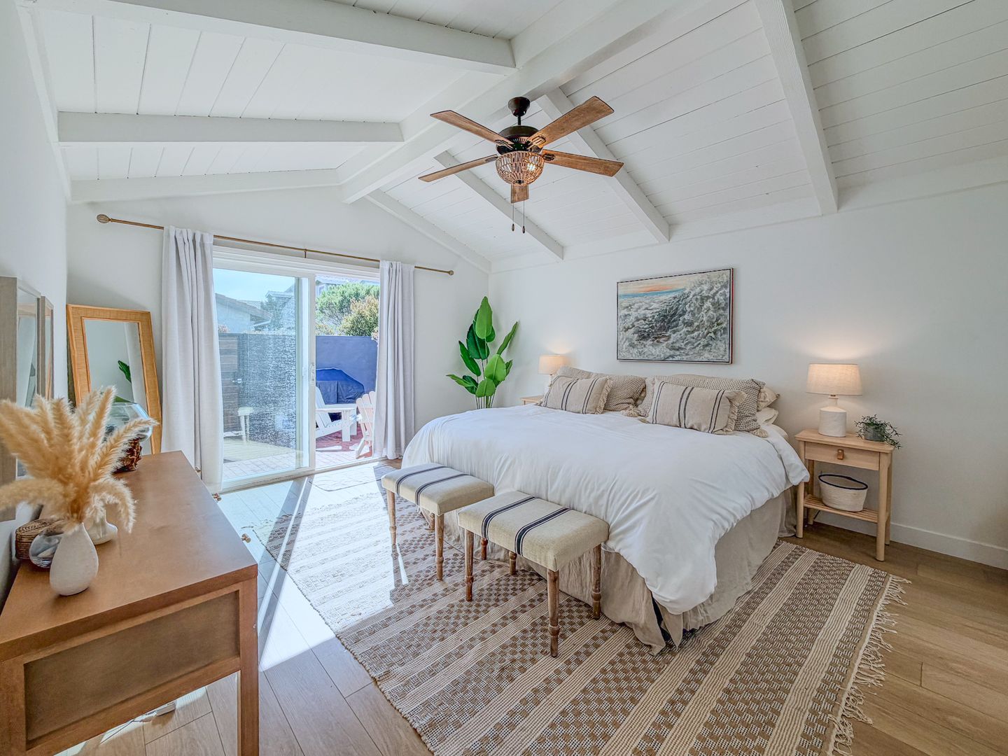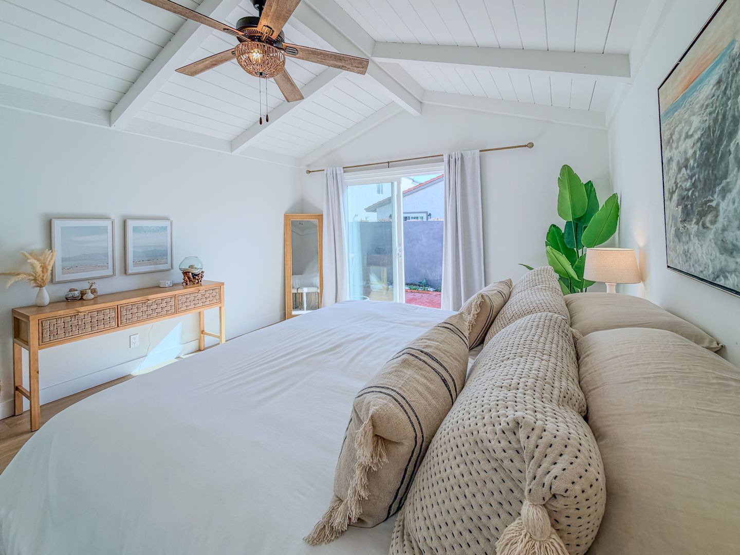 The primary suite is tucked at the back of the home, offering a peaceful retreat with its own ensuite bathroom and sliding door access to the expansive patio. Here, evenings are meant to be savored with a gentle ocean breeze, a barbecue ready for grilling, lounge chairs for unwinding, and a dining table set for al fresco meals under the coastal sky.