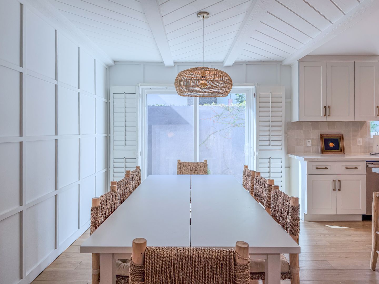 Welcome to 4954 Dolphin Way, a classic coastal retreat designed for easy living and carefree days by the shore. From the moment you step inside, the home opens into a bright, beach-inspired living space with tall ceilings, hardwood floors, and sunlight streaming in from every direction. The open floor plan creates a breezy flow from the living area to the fully equipped kitchen, where stainless steel appliances, generous counter space, and an inviting island provide everything needed for preparing meals after a day in the sand. The adjacent dining area offers ample seating and sits beside a sliding door that leads directly to the patio and convenient outdoor shower, echoing the effortless rhythm of life near the ocean.