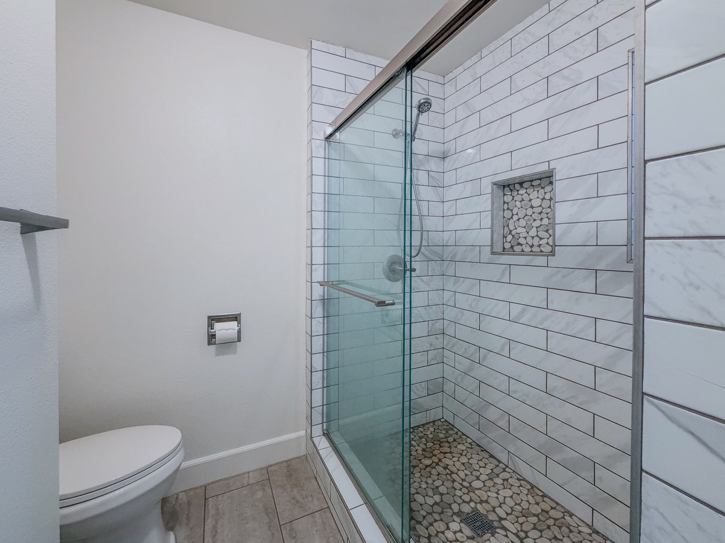 As you move deeper into the cottage, a full bathroom with a shower and tub combination serves two large, comfortable bedrooms. The primary suite is a serene retreat complete with its own ensuite bathroom featuring dual sinks and a step-in shower designed for unwinding after sun-soaked days on the shore.