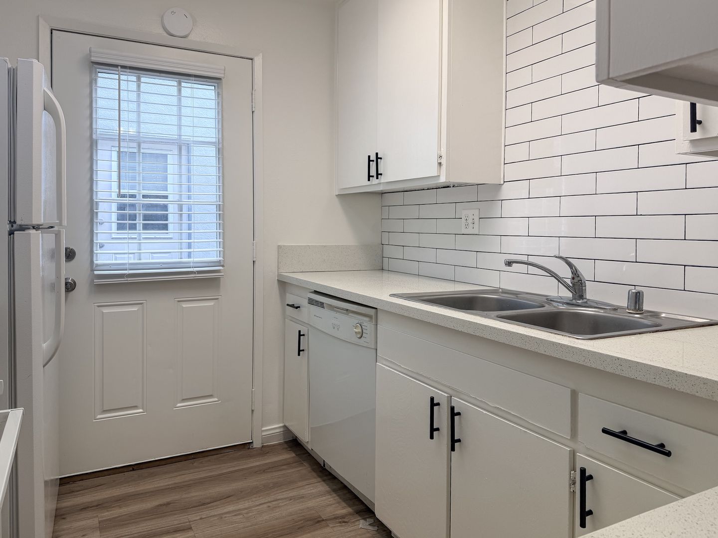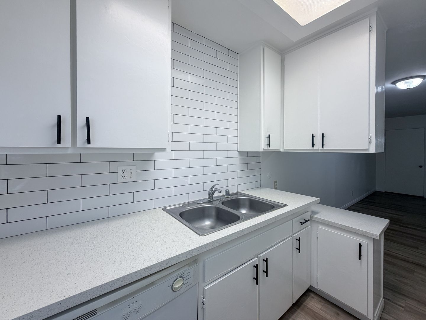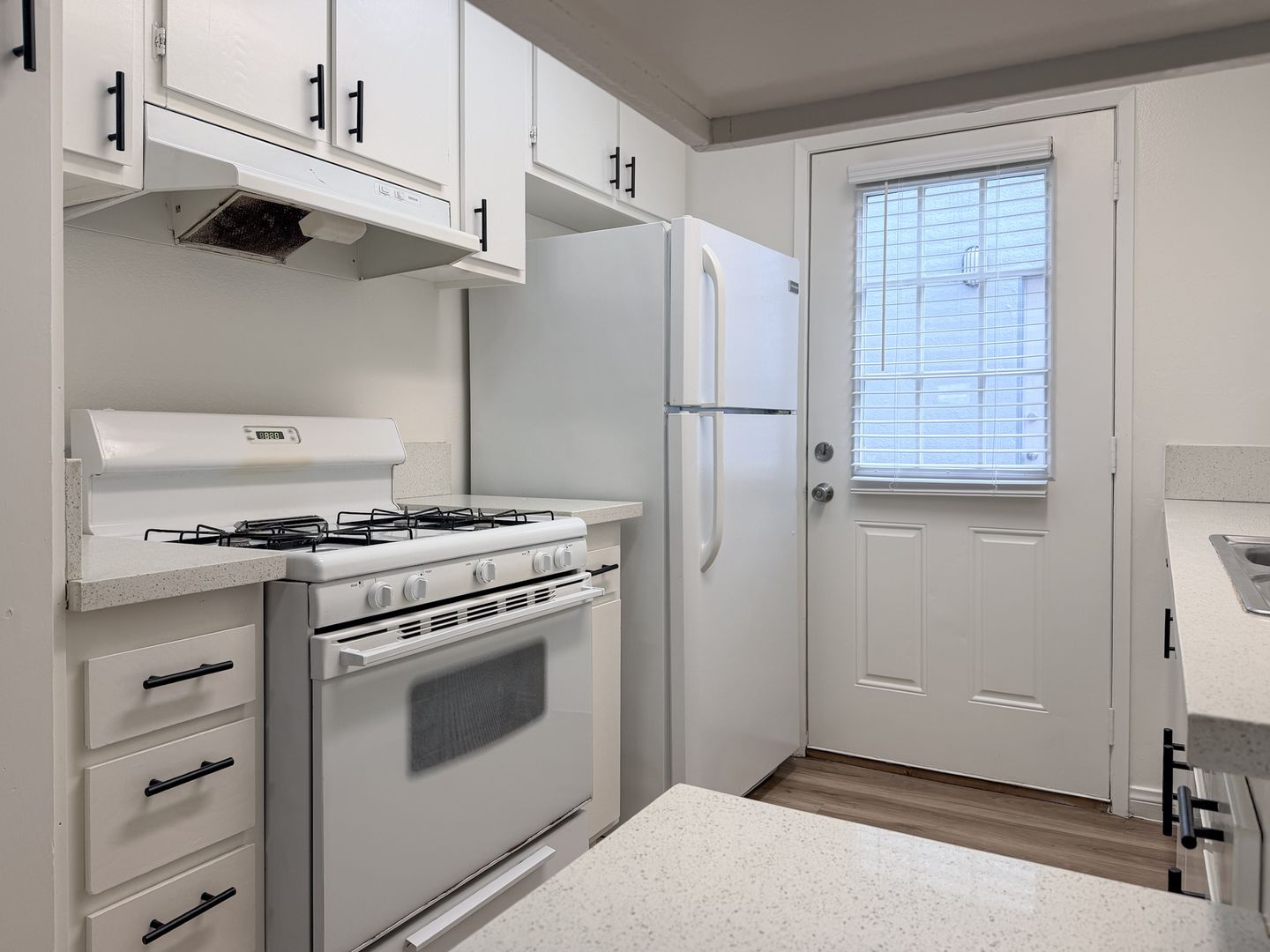 The full kitchen is equipped with a stove, dishwasher, and refrigerator, providing both functionality and convenience. The spacious primary bedroom includes a large closet, offering ample storage. Residents also enjoy access to a shared garage and on-site coin-operated washer and dryer facilities.