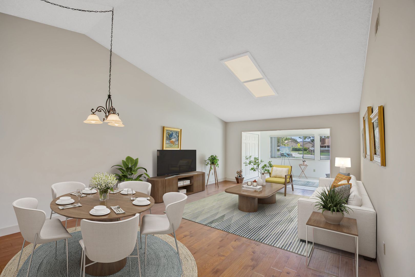 The living room boasts vaulted ceilings, skylights, and rich wood flooring, creating a bright and airy atmosphere. A sunroom-style enclosed patio with a closet extends the living area—perfect for reading, crafting, or hosting friends.