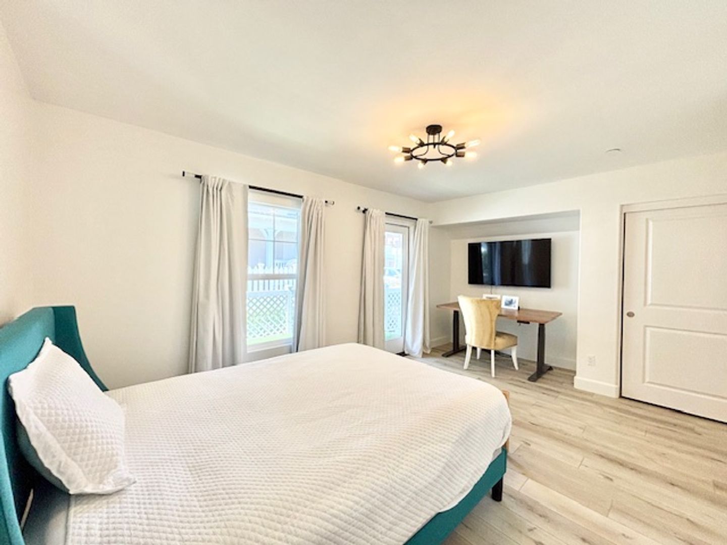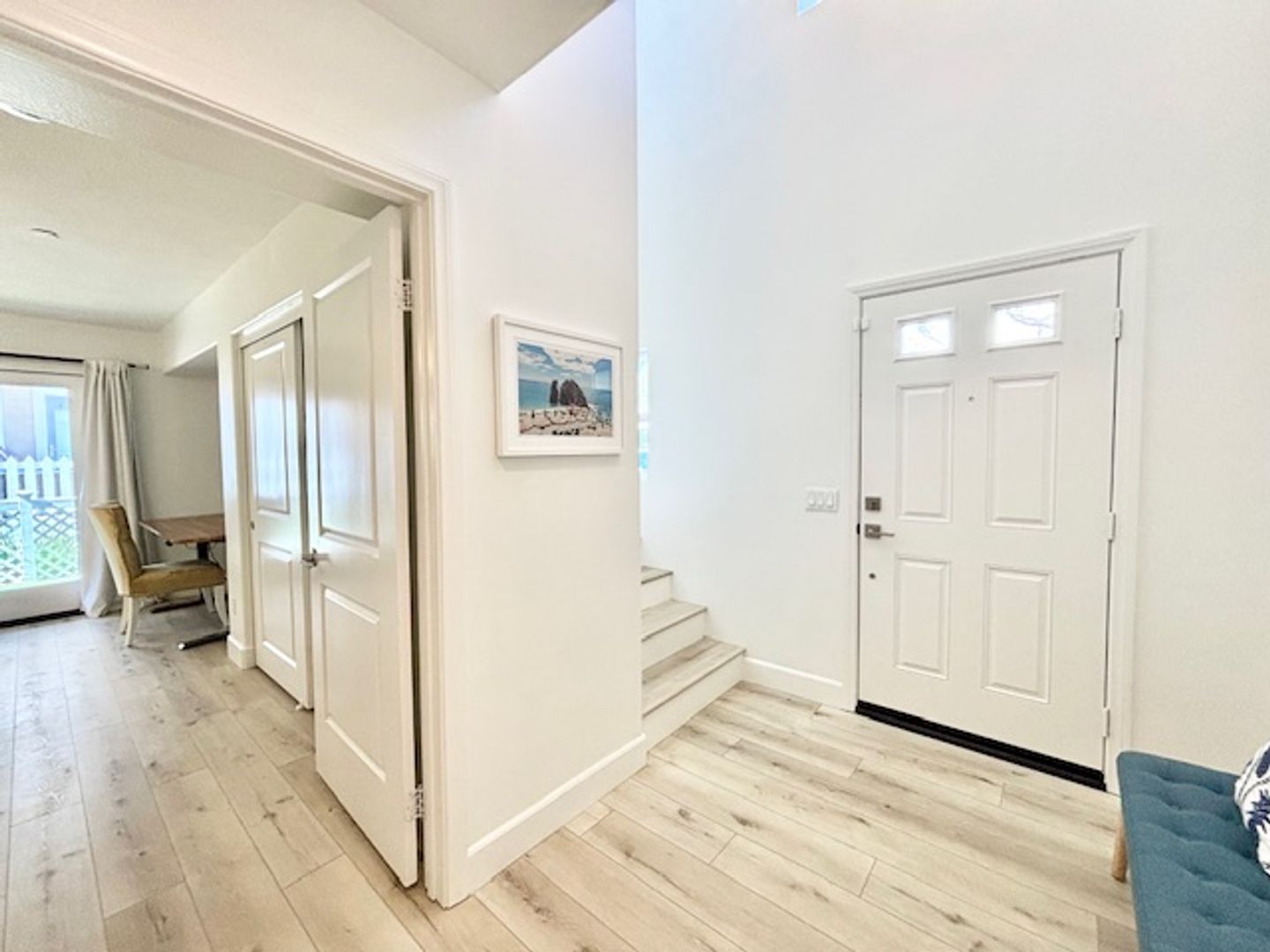 As you step inside, you're welcomed by an impressive entryway featuring elevated ceilings and a stunning chandelier that sets the tone for elegance. Ascend to the main living area, where you'll find a generous living room that seamlessly connects to a private patio, perfect for relaxing or entertaining. The luxurious kitchen is a culinary delight, showcasing sleek white cabinetry paired with warm countertops, stainless steel appliances, and a cozy dining nook that makes every meal a special occasion.