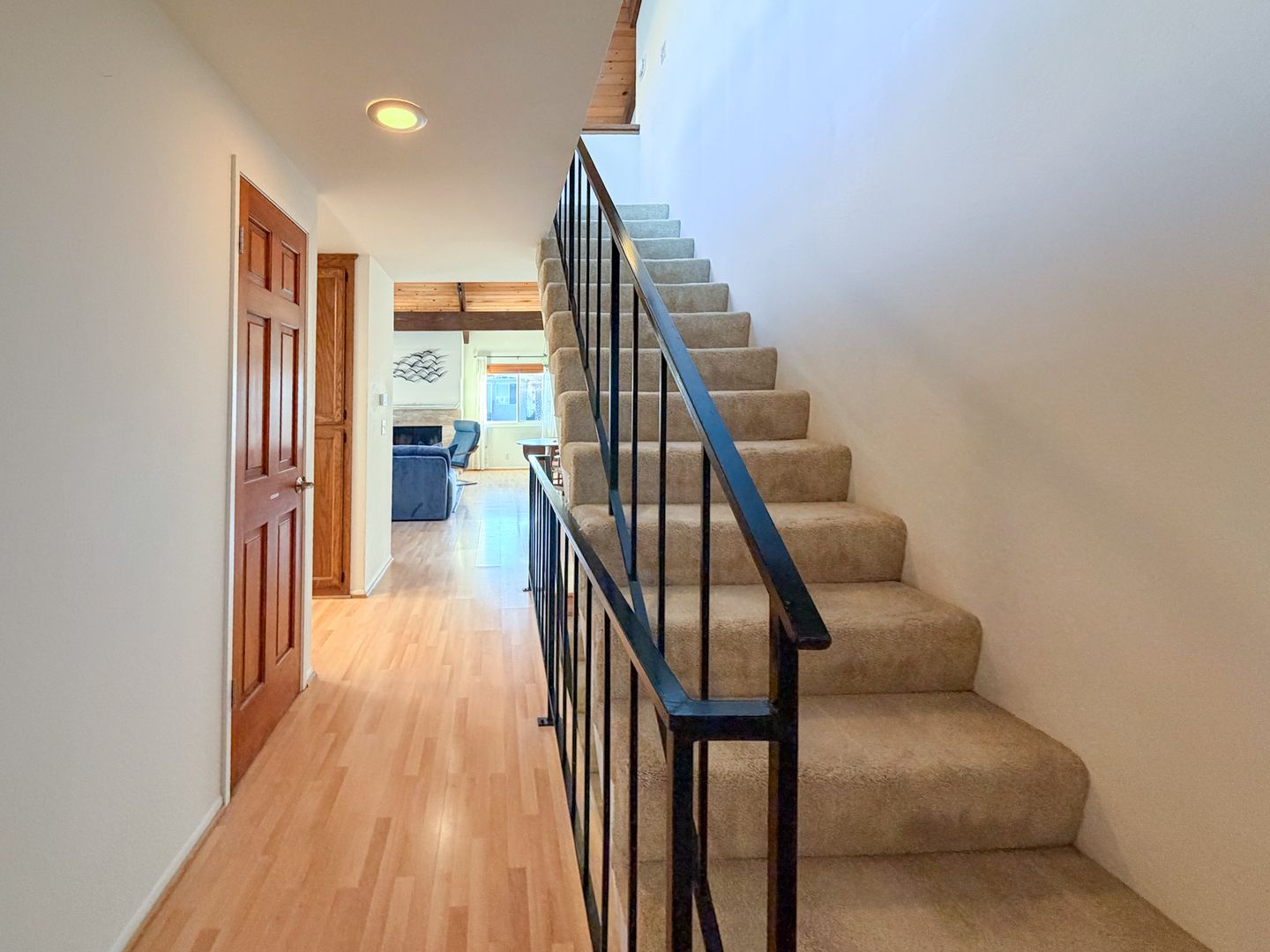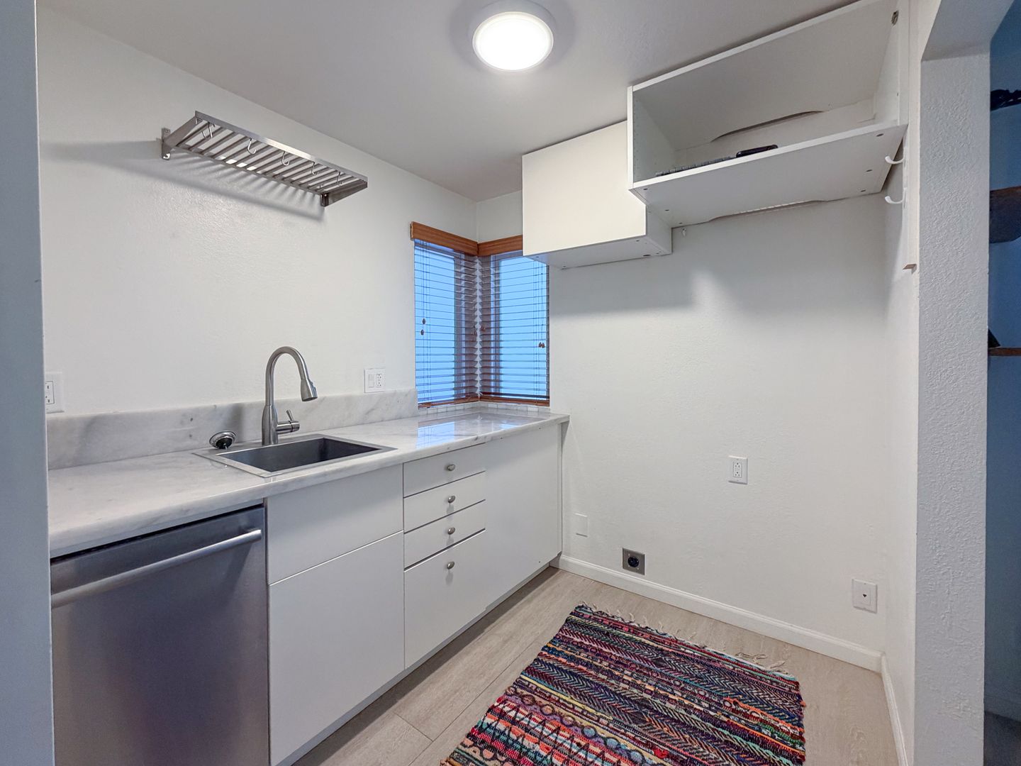 When you enter the property, head up the stairs to find the living room, kitchen, main bedroom and a full bathroom. The living room has high ceilings, a fire place, and super cute beach décor. The kitchen has brand new countertops and plenty of cabinet space. Just down the hall, find the main bedroom, with a king bed, and newly updated full bathroom.