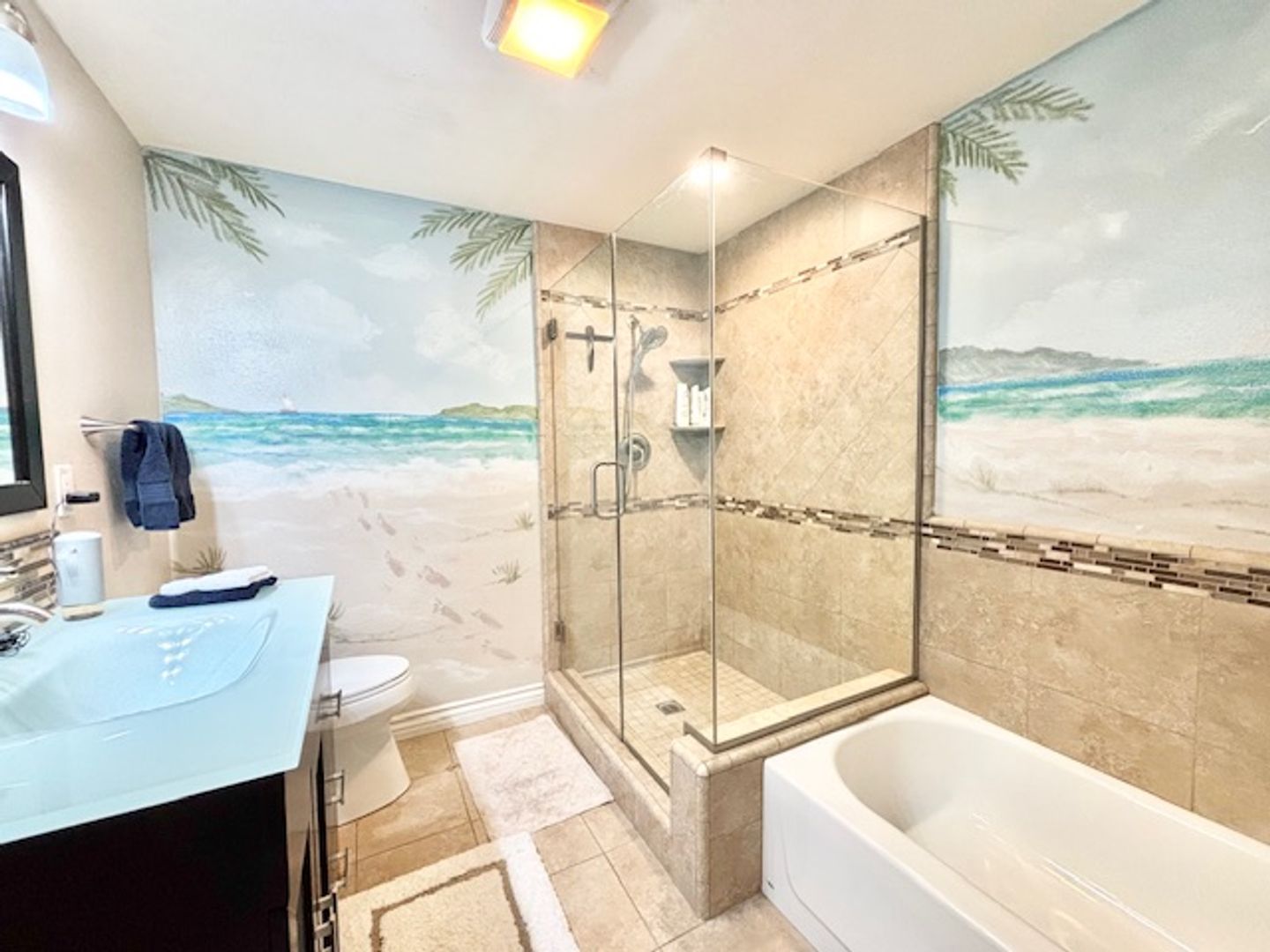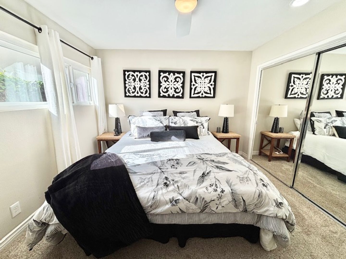 Descending to the first level, you’ll find two additional spacious bedrooms, one equipped with a walk-in closet and the other featuring mirrored closet doors that enhance the feeling of space. All bedrooms are elegantly decorated and furnished with new bedding, ensuring a classy and comfortable stay.