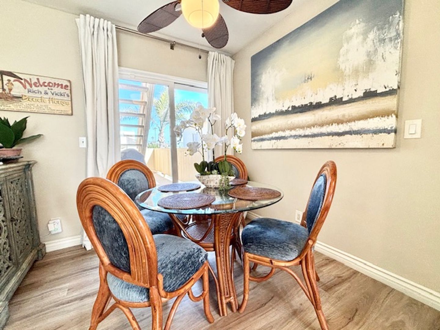 As you enter, ascend the stairs to the main level, where you’ll be welcomed by a spacious open-concept living area adorned with all new, stunning modern decor and a beachy vibe. The kitchen features elegant dark cabinetry, gleaming white countertops, and all the necessary appliances, setting the stage for culinary delights. Enjoy meals in the cozy dining area for four, which also provides access to the rooftop deck.