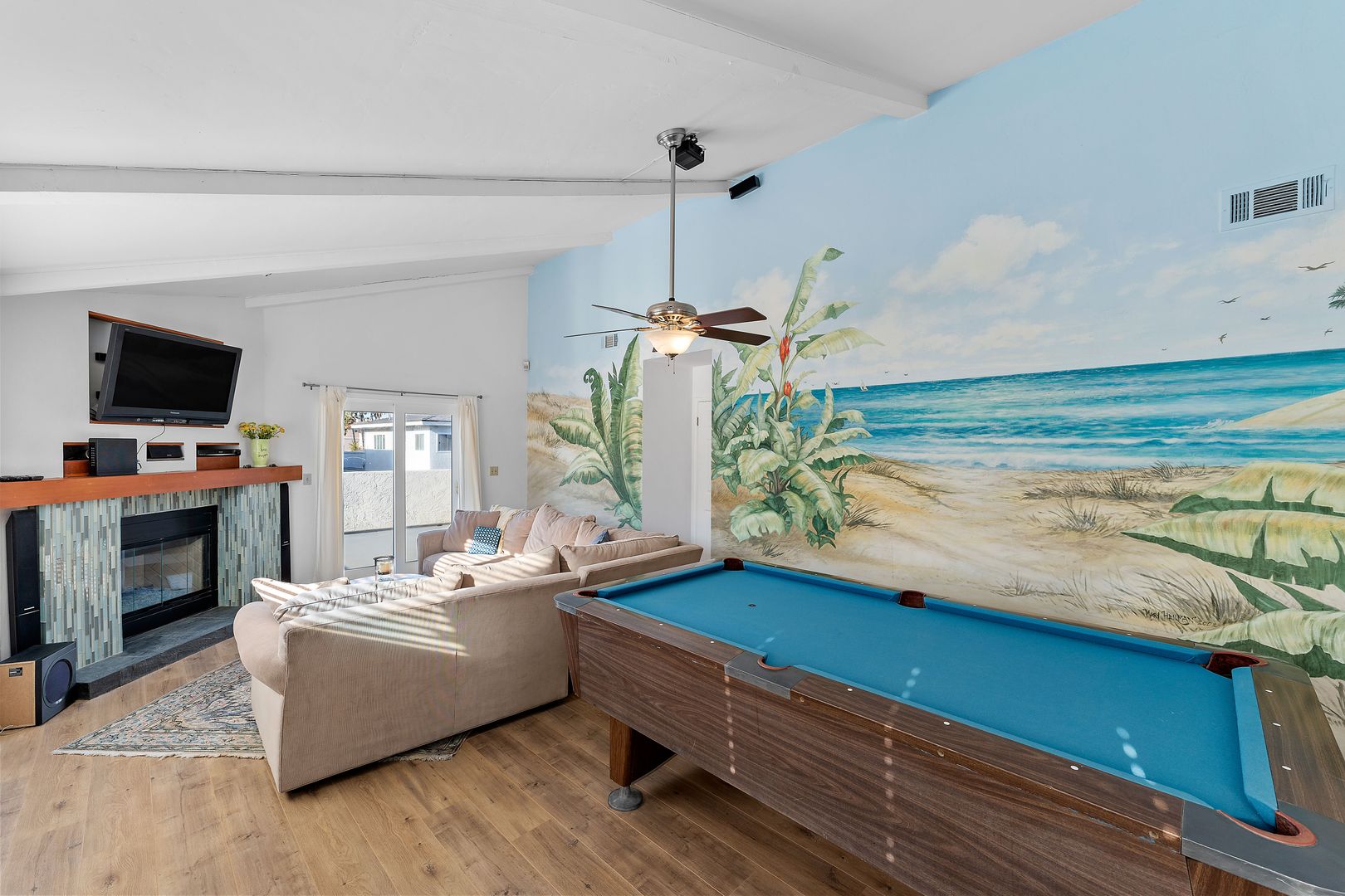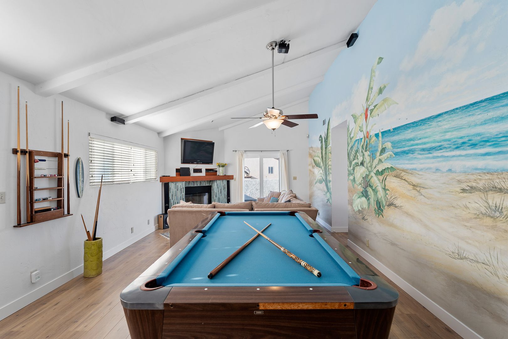Just up the stairs is another living room equipped with a sectional, fireplace, flat screen TV and a pool table! The high table offers seating for two and is the perfect spots to watch a game of pool.