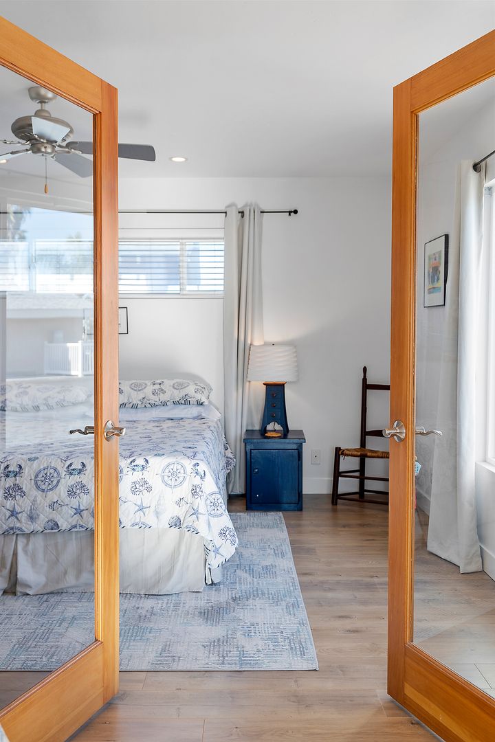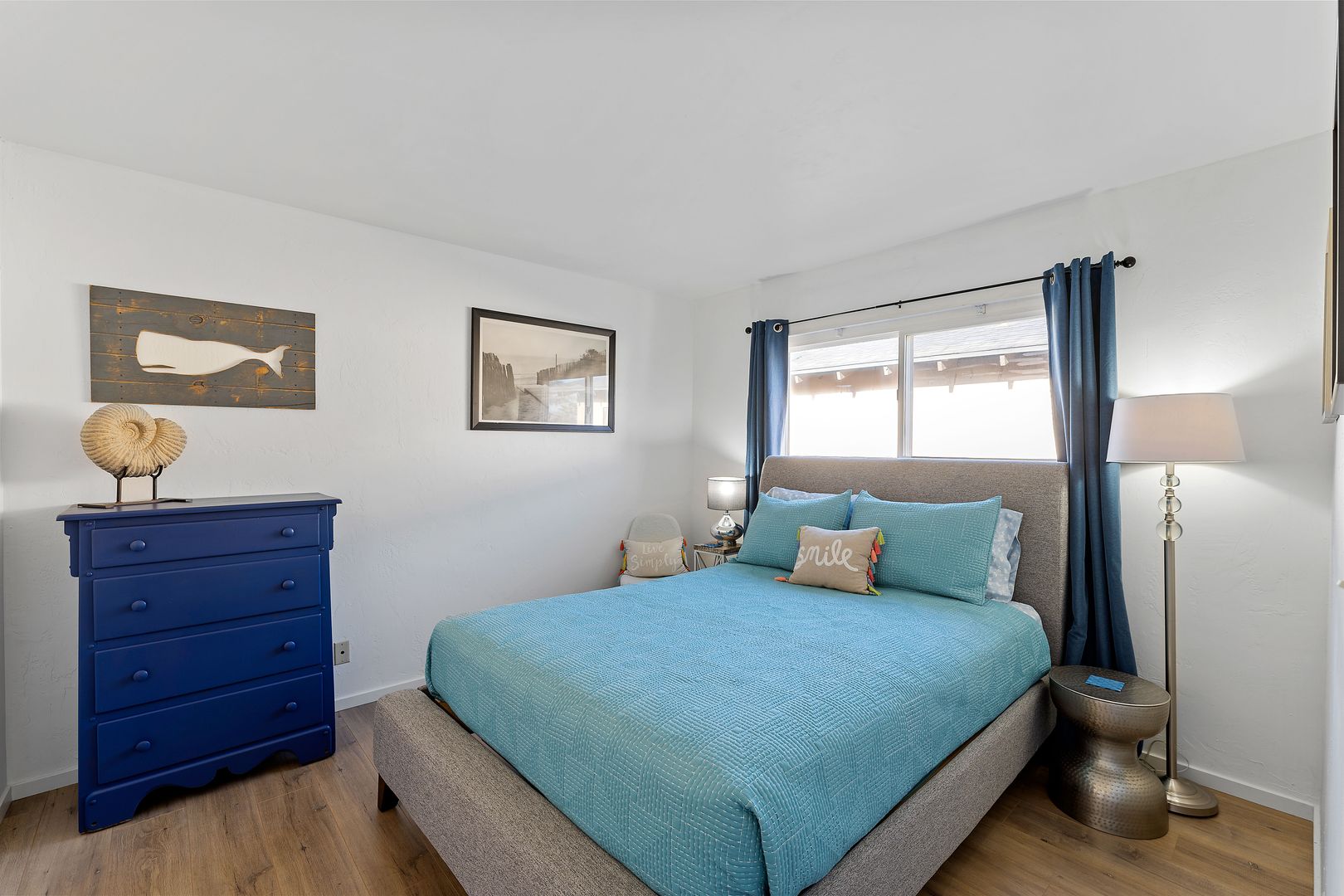 Enter into the property to be greeted by the open concept living room, dining area and kitchen!! This home has been beautifully decorated to create the perfect combination of beach house, luxury and relaxation. The living room has a flat screen TV and plenty of comfortable seating. The dining table is so adorable with a unique shell chandelier hanging over. The kitchen has all stainless steel appliances, a keurig coffee maker, and so much counter space! The kitchen island is where you will find the kitchen sink and additional bar seating for three. There is one bedroom on the first floor with a queen sized bed and a sliding glass door to the spacious backyard.