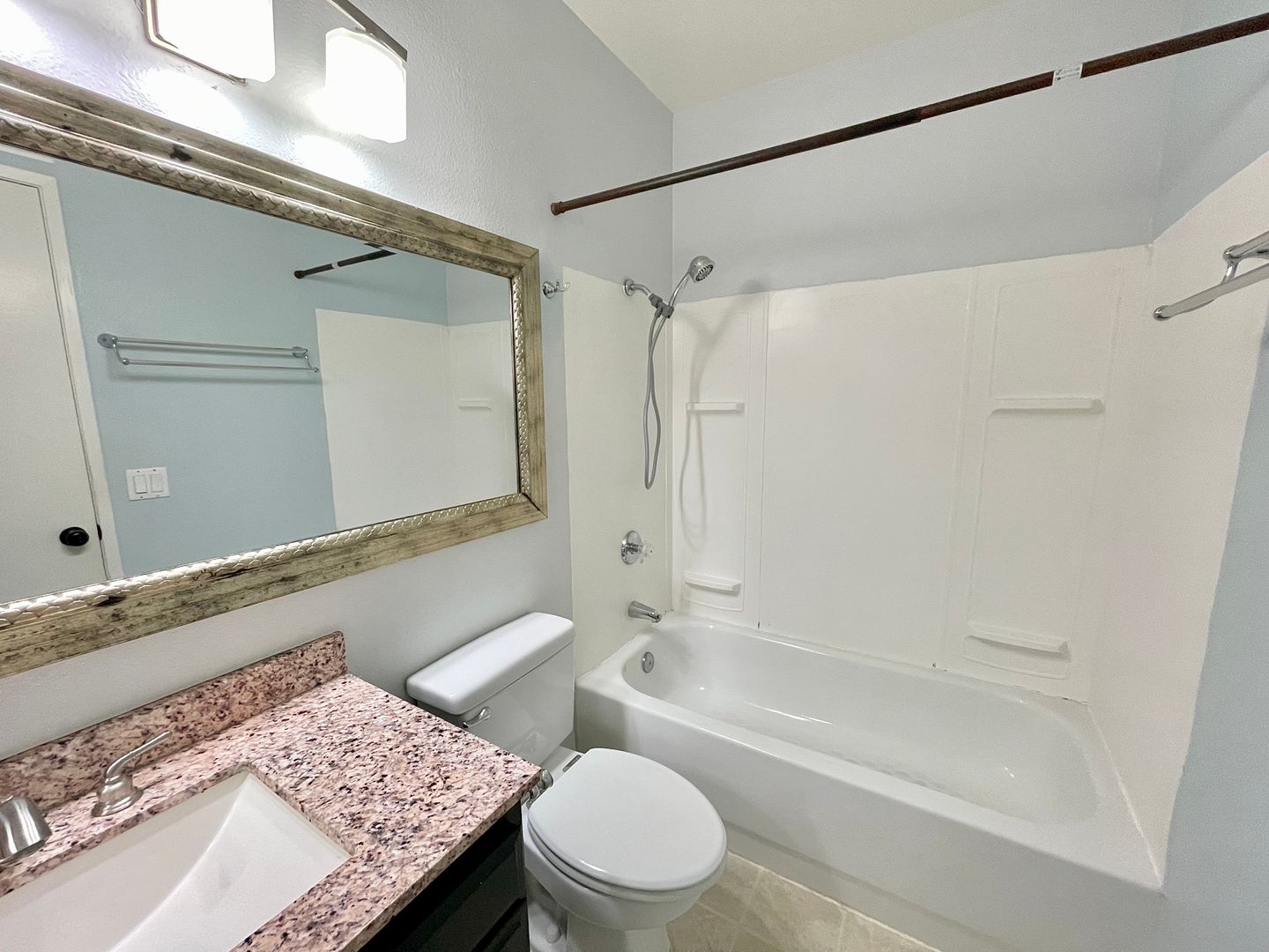 Just up he stairs is the two bedrooms and the full bathroom. Both bedrooms have ceiling fans with lights, and plenty of natural light! The master bedroom has a walk in closest and sliding glass doors to the second private balcony. Enjoy a view of the ocean from this balcony!